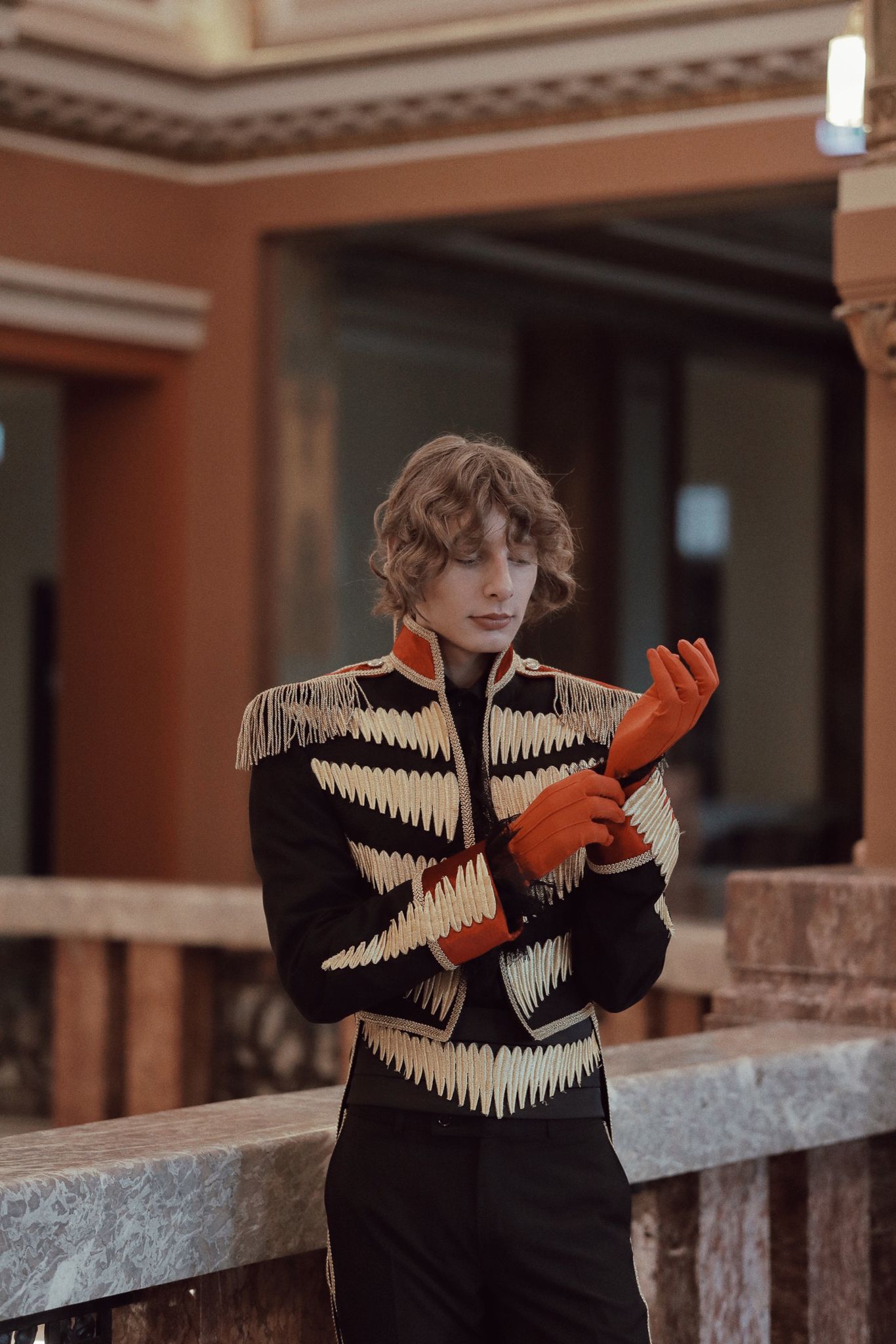 The tailcoat is paired with a cummerbund and trousers. Per request, you can also order a matching shirt.