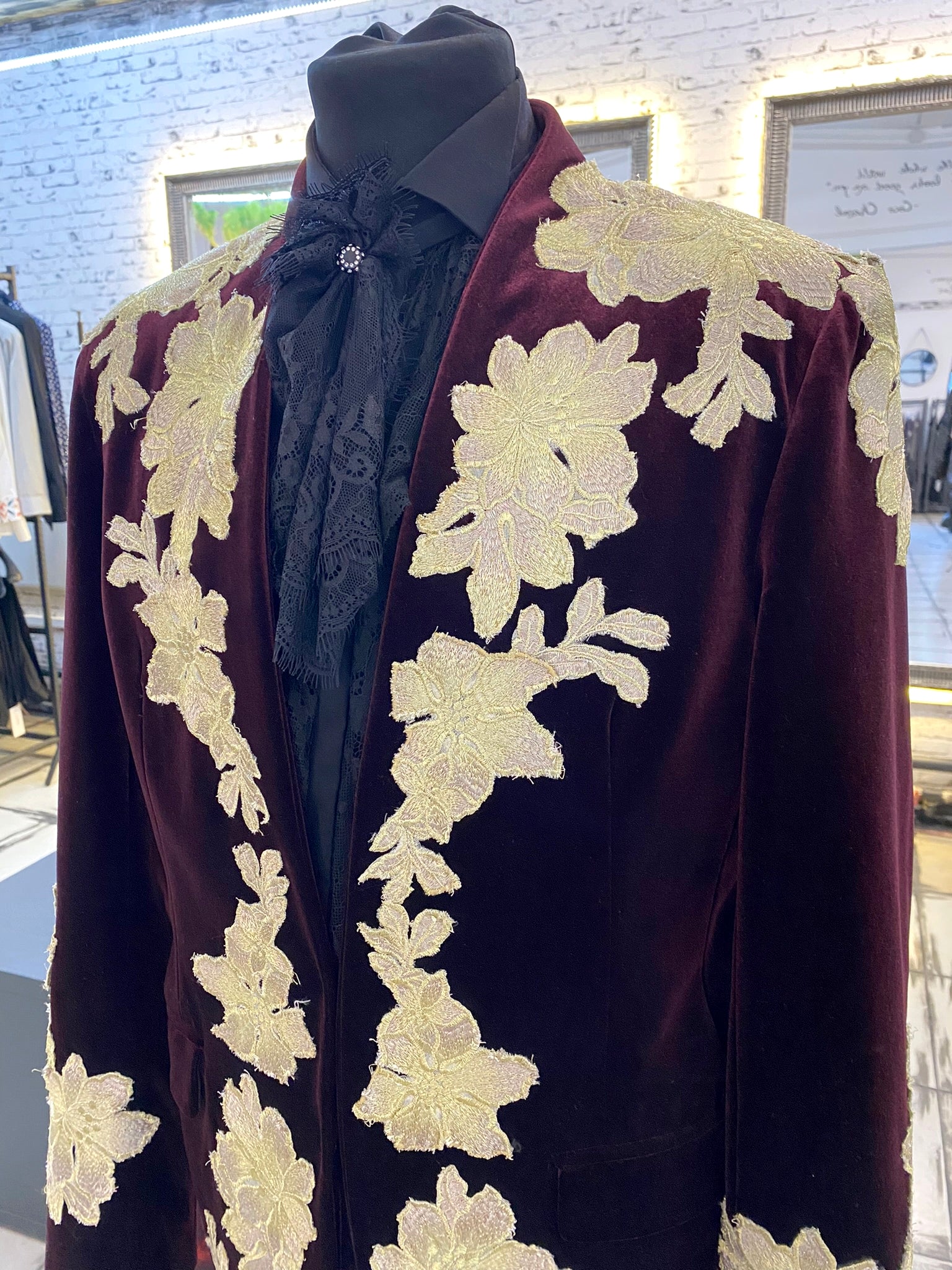 The velvet coat has can be paired with black trousers and a black shirt with French lace lavalier.