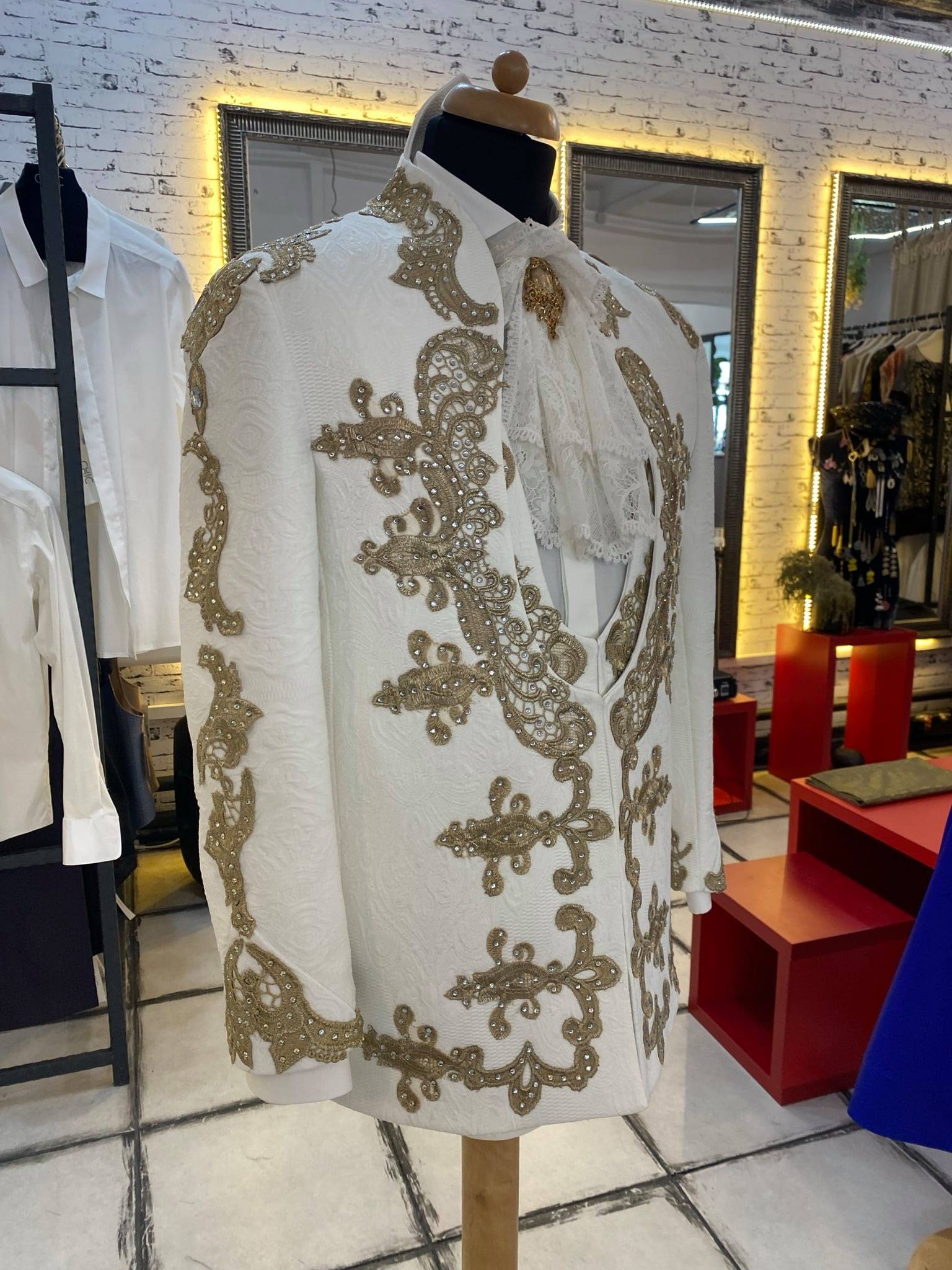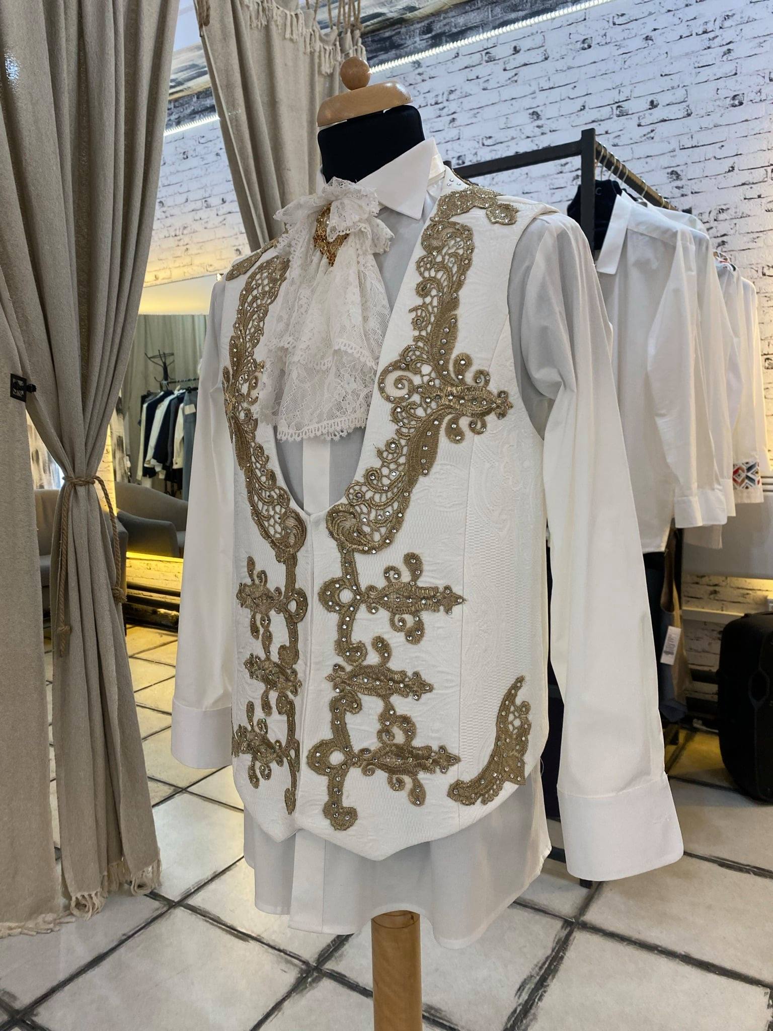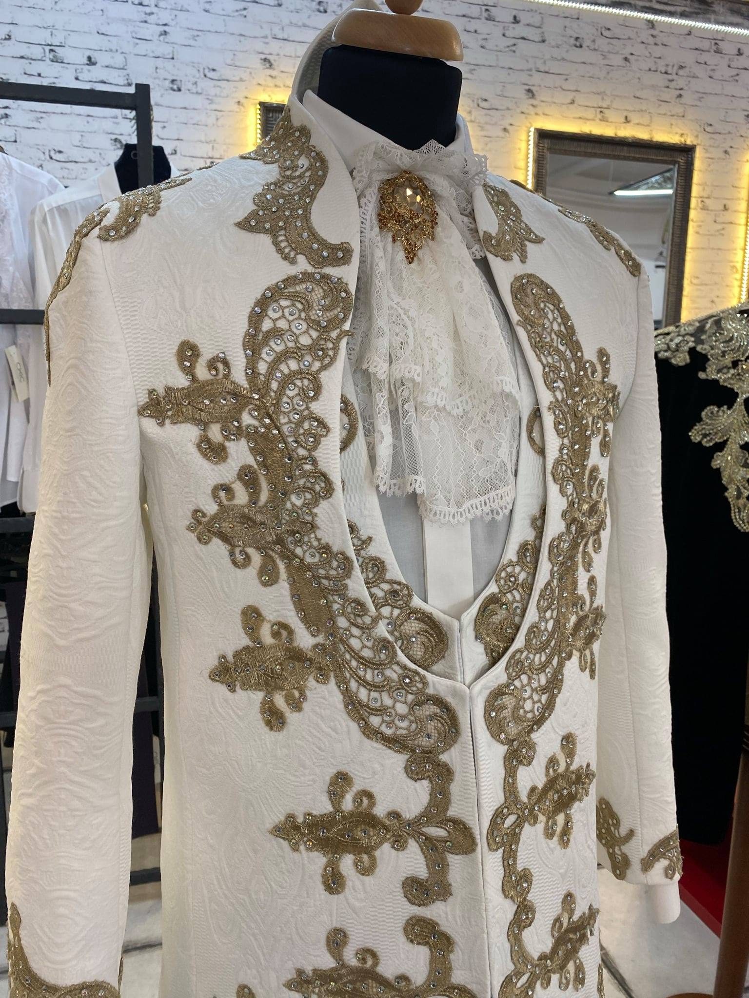 The suit includes an ivory brocade jacket with a matching vest, ivory trousers and a shirt with a lace lavalier.