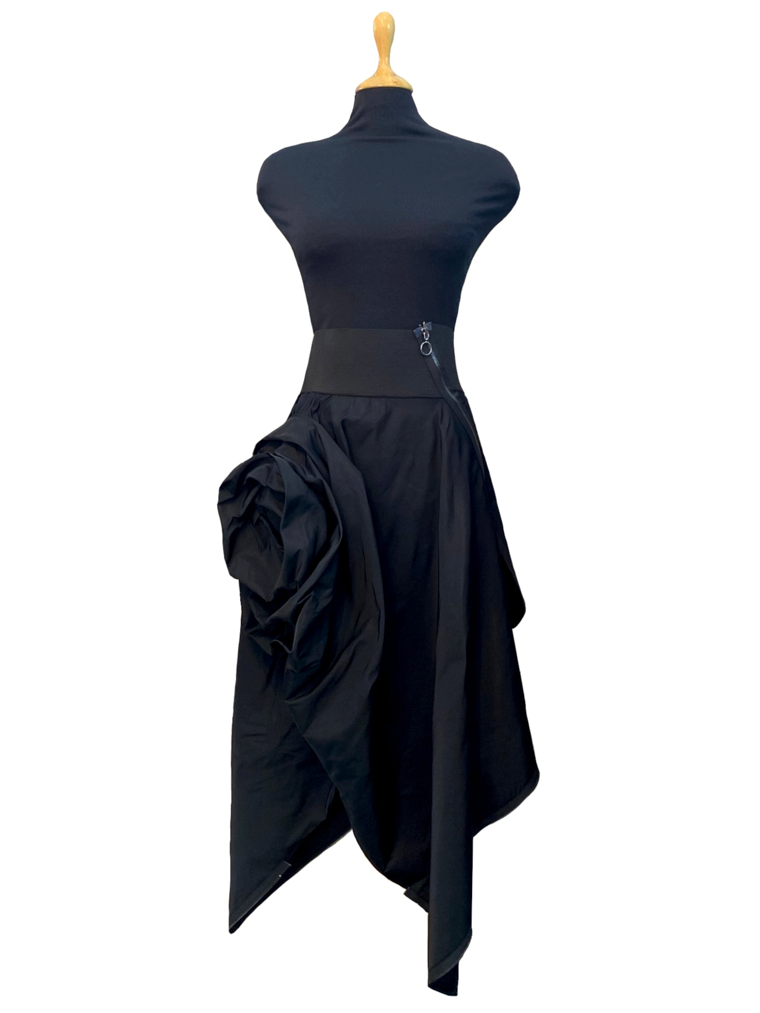 Asymmetrical black skirt with a metallic zipper. The skirt can be worn both with the zipper in front and in the back and the creative draping makes it a statement piece of any outfit.