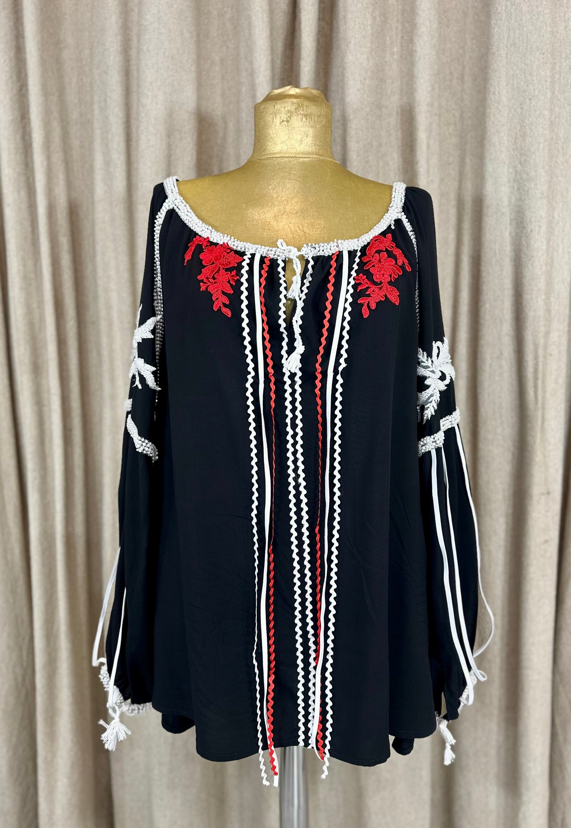 Stand out in this black silk blouse with Romanian-inspired details. Bring a touch of tradition to your wardrobe and feel luxurious in this unique piece.