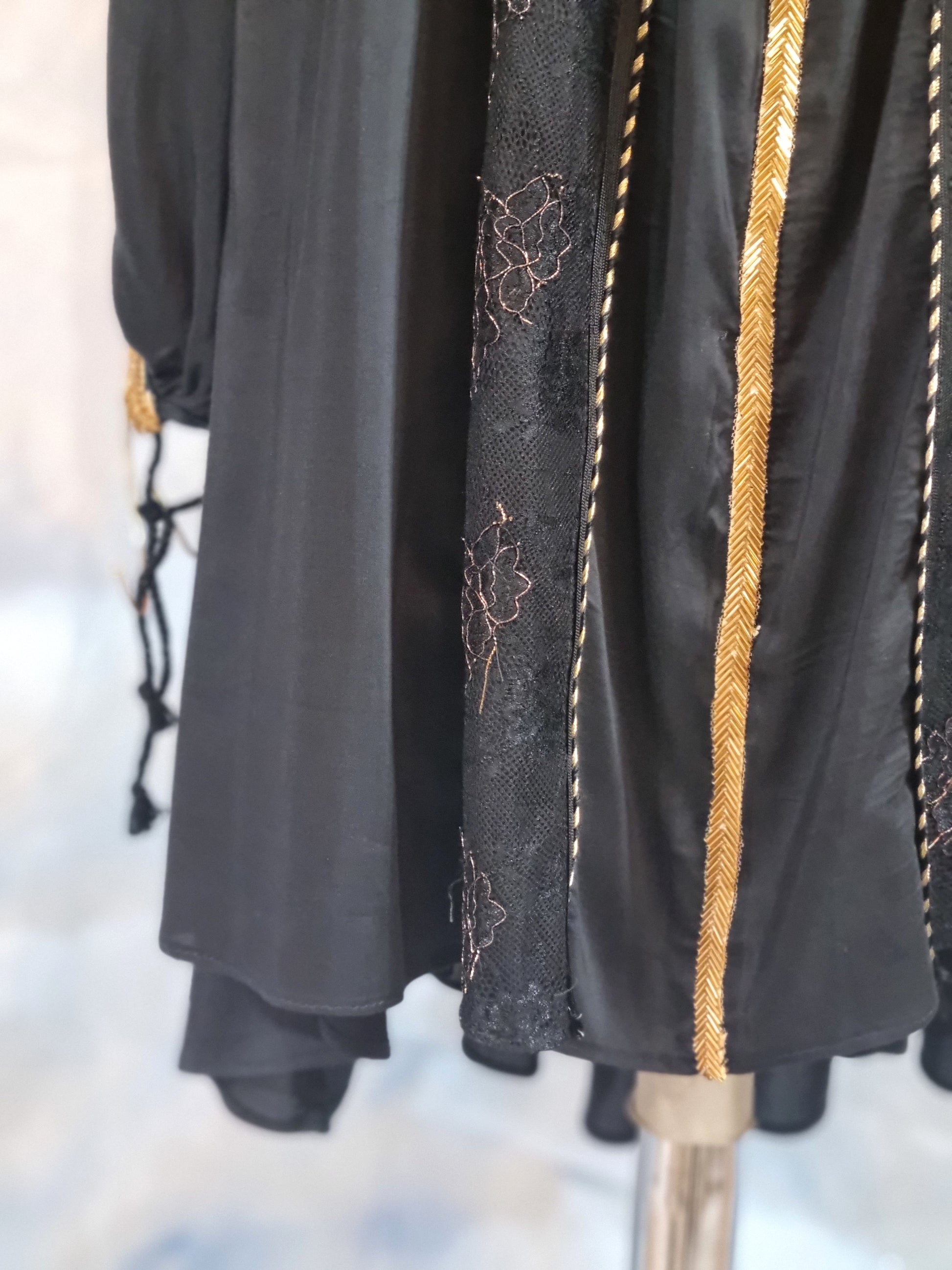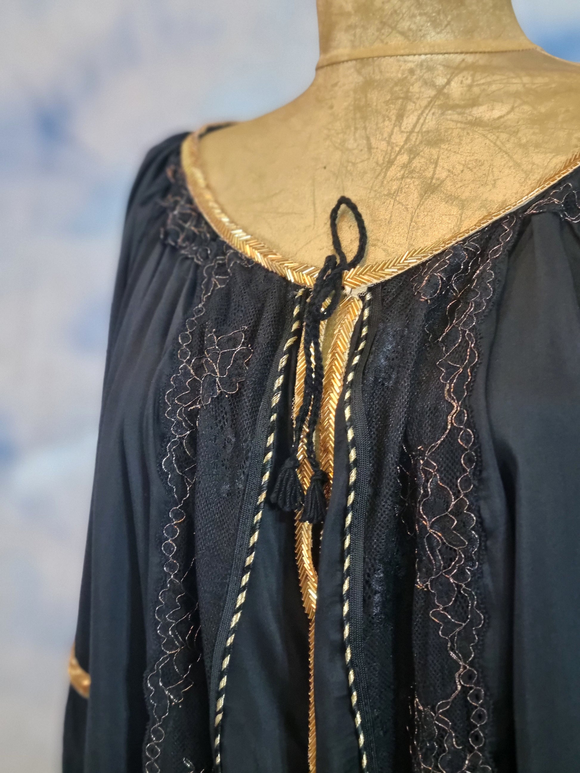 Let your beauty shine in this exquisite Black Silk Dress With Gold Embroidery! Inspired by the traditional Romanian blouse, its intricate embroidery is a timeless combination of beauty and style.