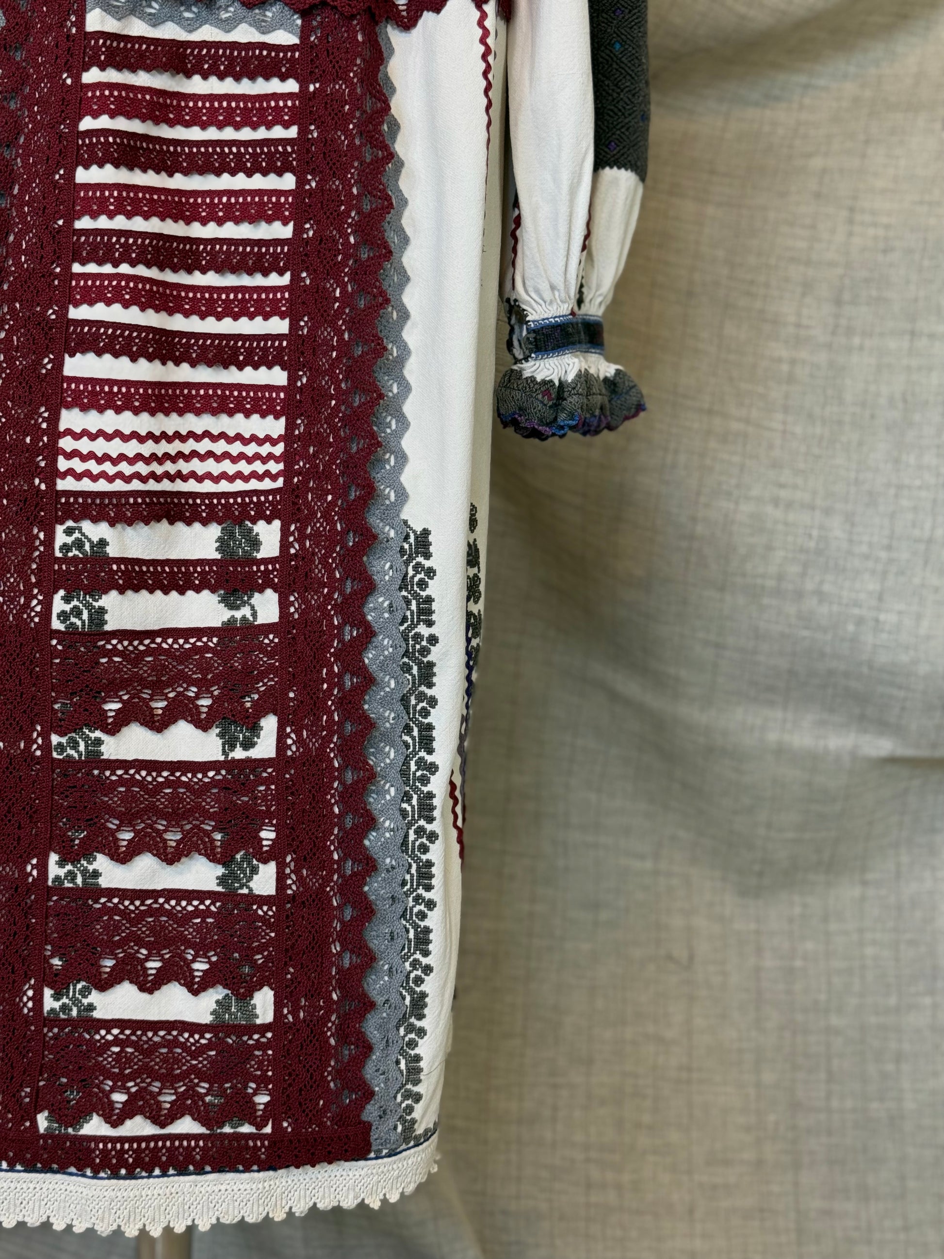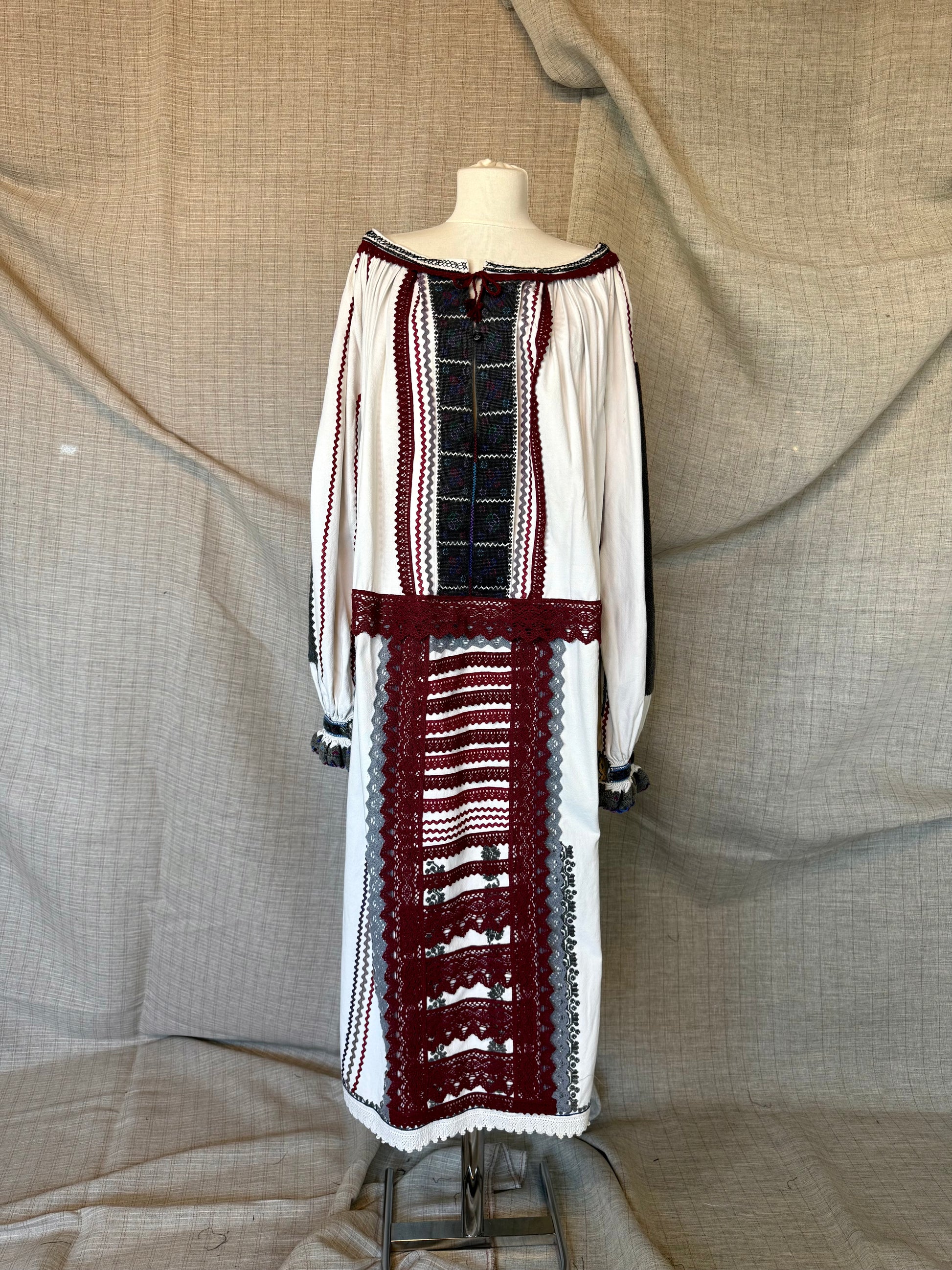 Romanian-Folklore Inspired Midi-Dress with Burgundy Embroidery