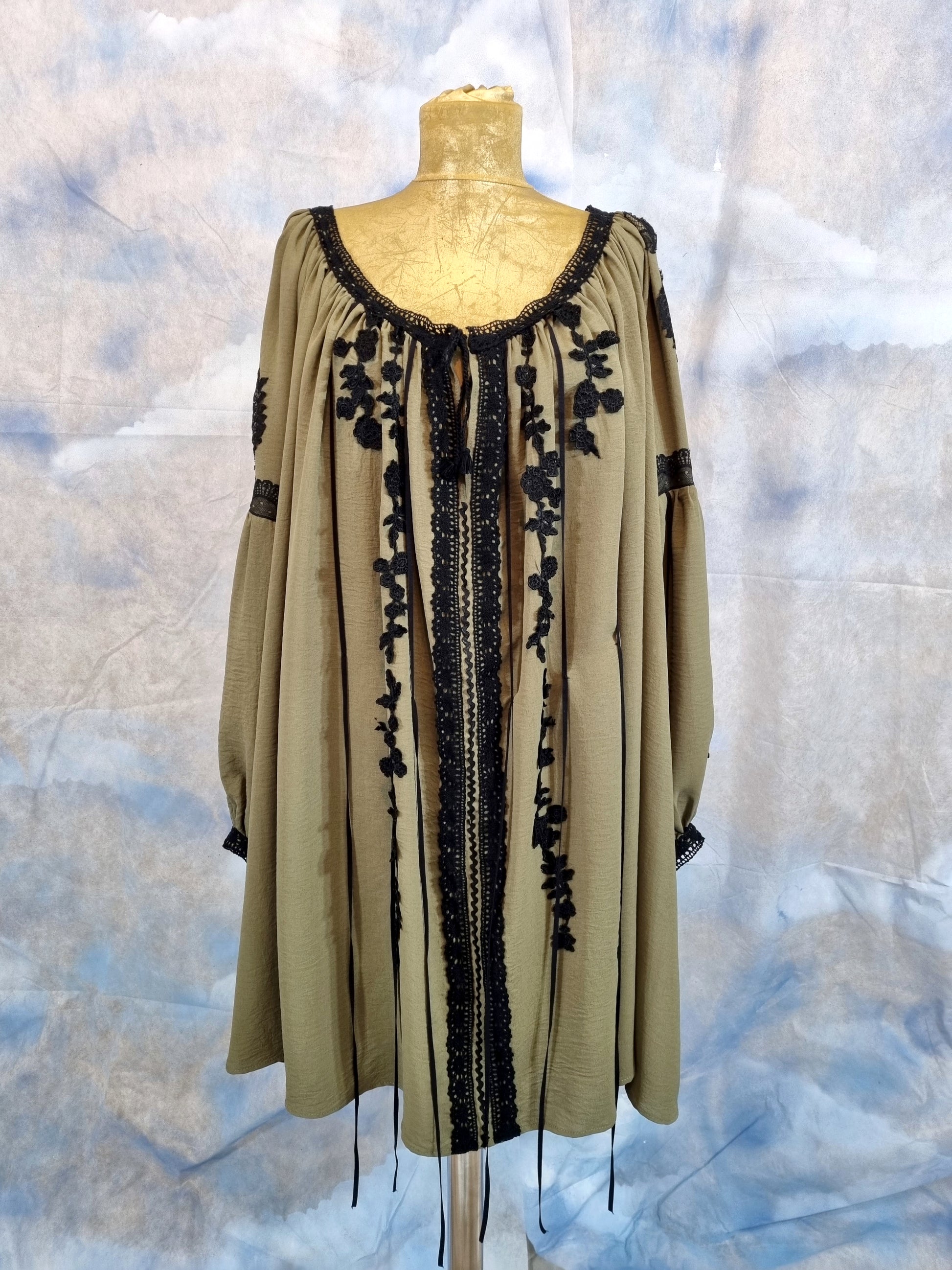 Look beautiful and unique in this Olive Green Blouse With Black Lace Embroidery! Inspired by the Romanian traditional blouse, this eye-catching piece will radiate a timeless elegance and style perfect for any occasion.