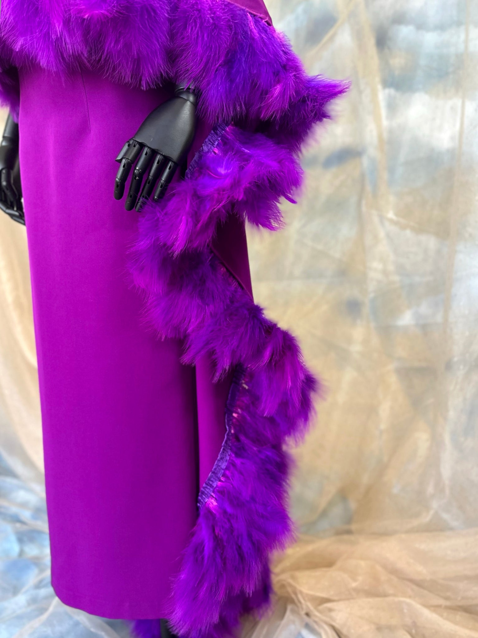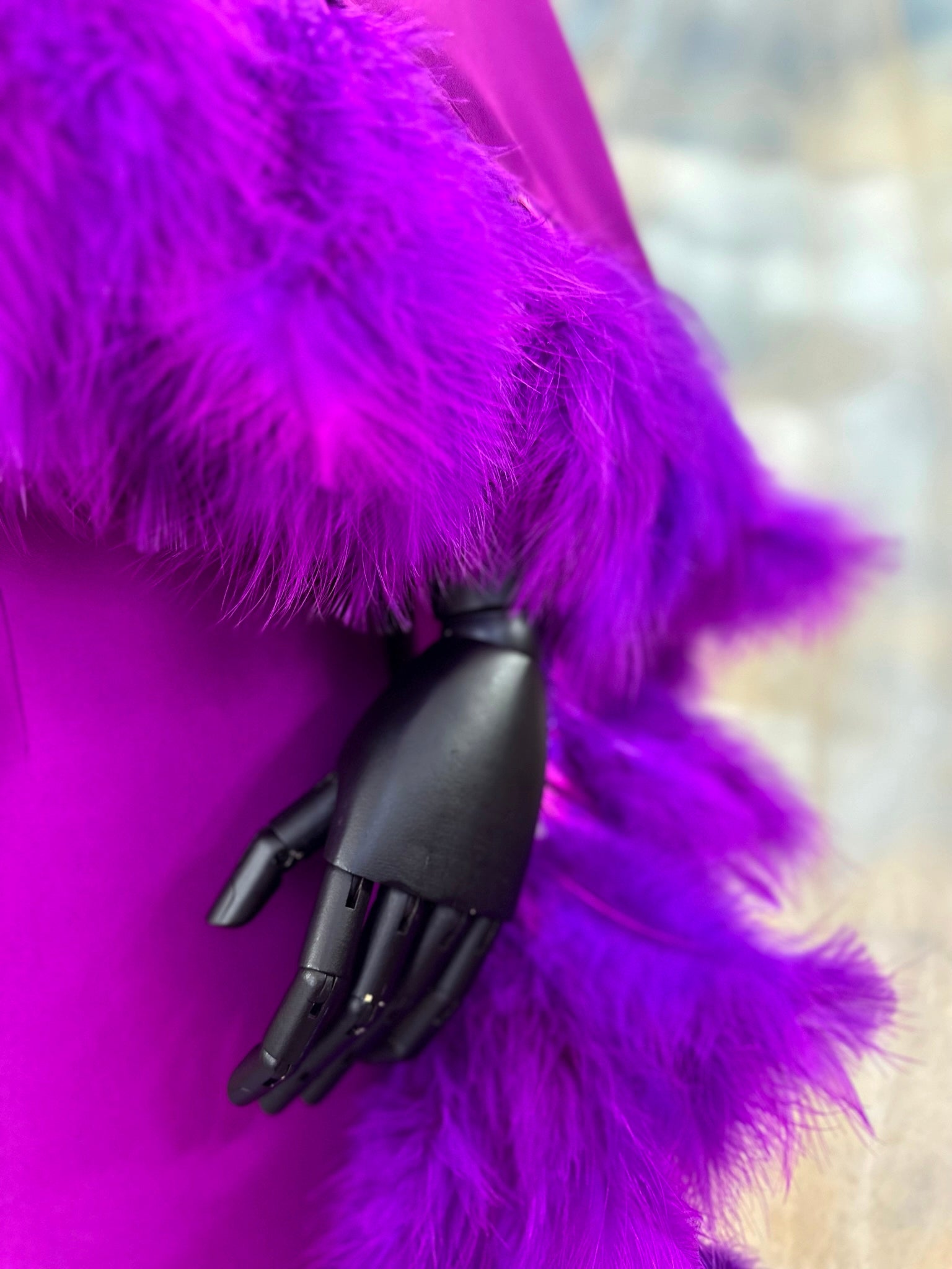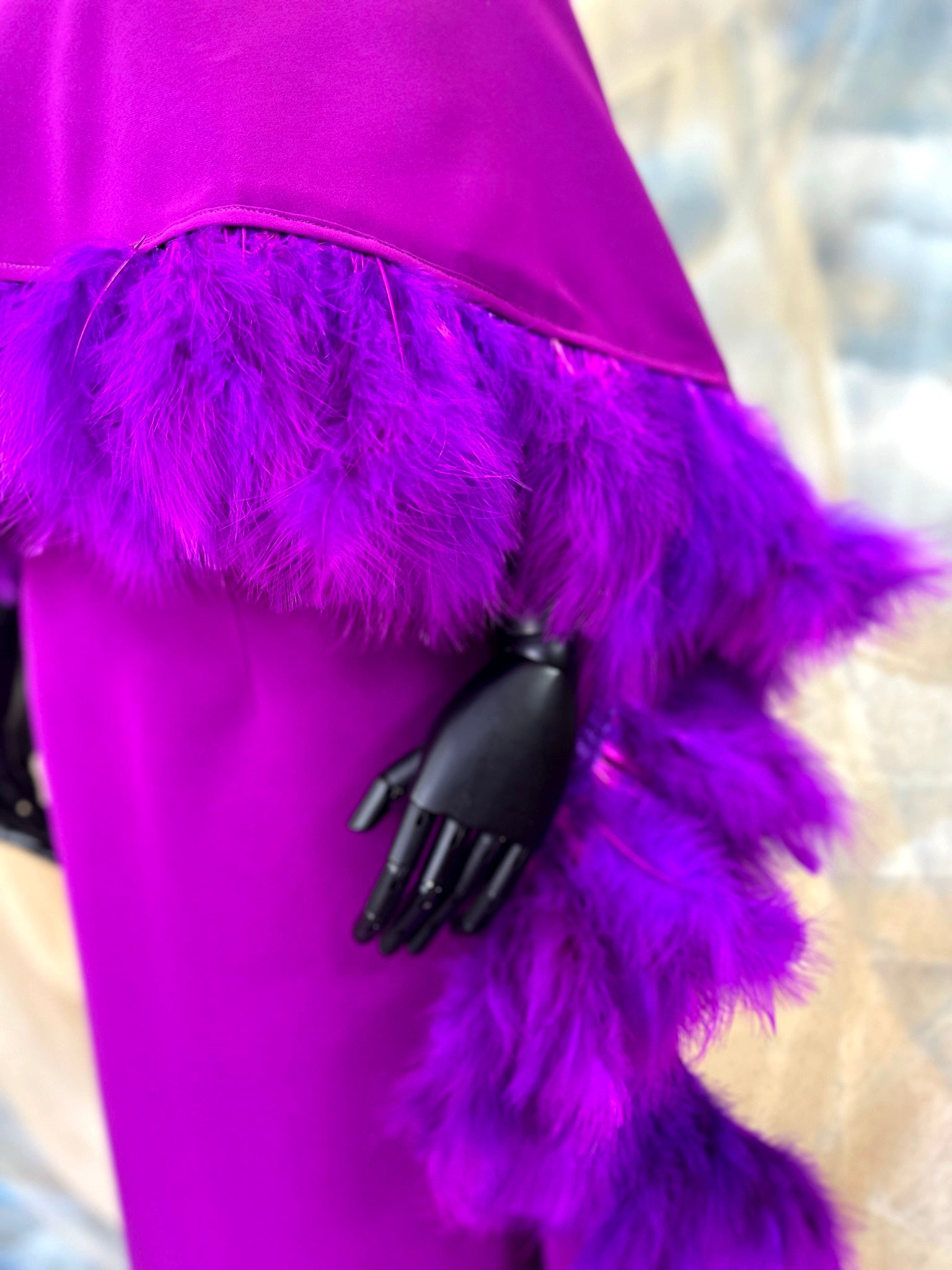 Introducing our luxurious one-shoulder magenta dress, featuring a sophisticated feather trim. Crafted from the highest quality fabrics, this timeless piece of evening wear exudes refined elegance and effortless style. An ideal choice for special occasions, you will mesmerize with its understated glamour.
