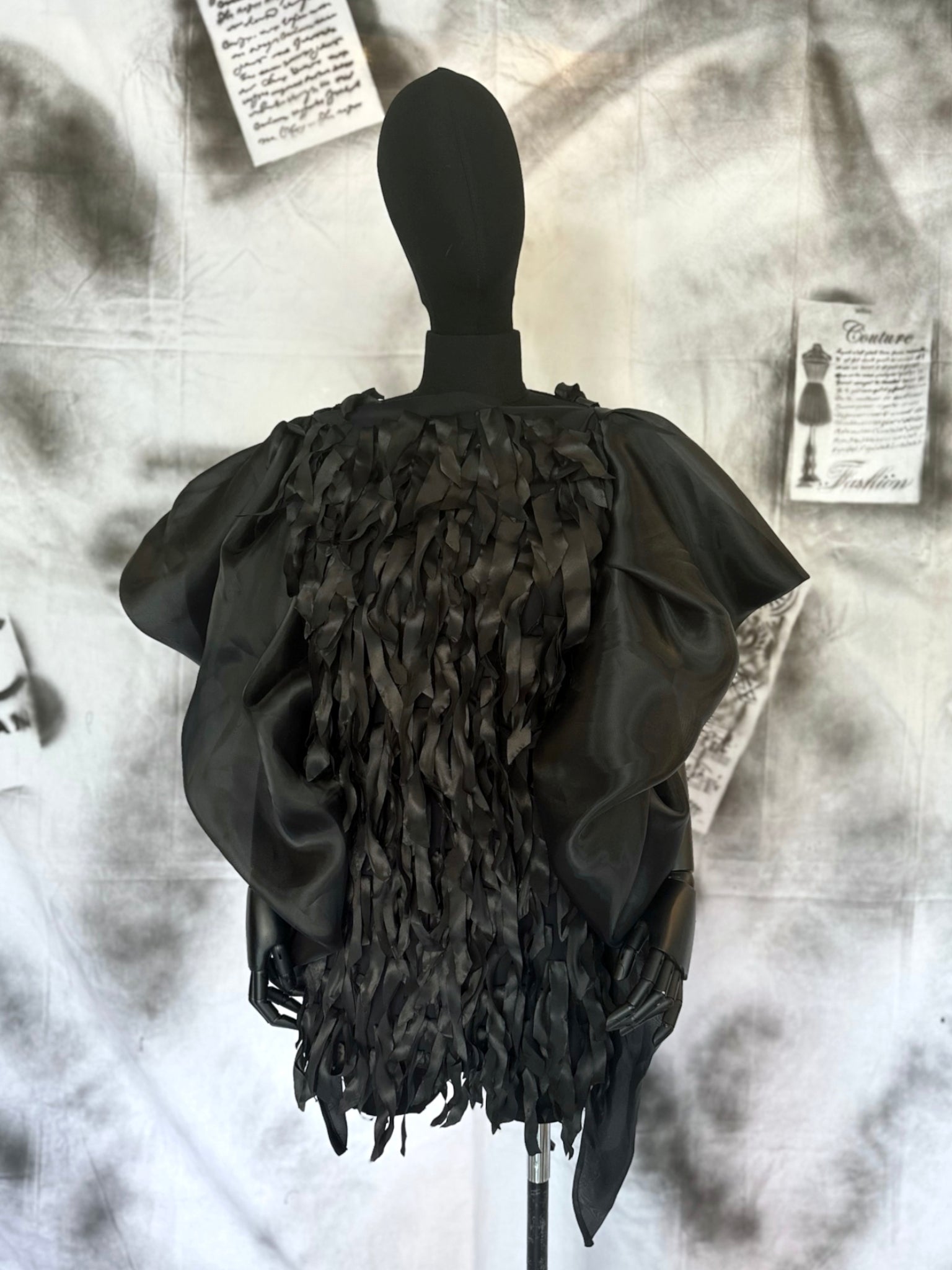 Look stunning in this Puzzle Taffeta Fringe Dress With Organza Sleeves. This beautiful dress features handmade fringe details and voluminous organza sleeves. Make an unforgettable statement with this eye-catching and graceful ensemble!