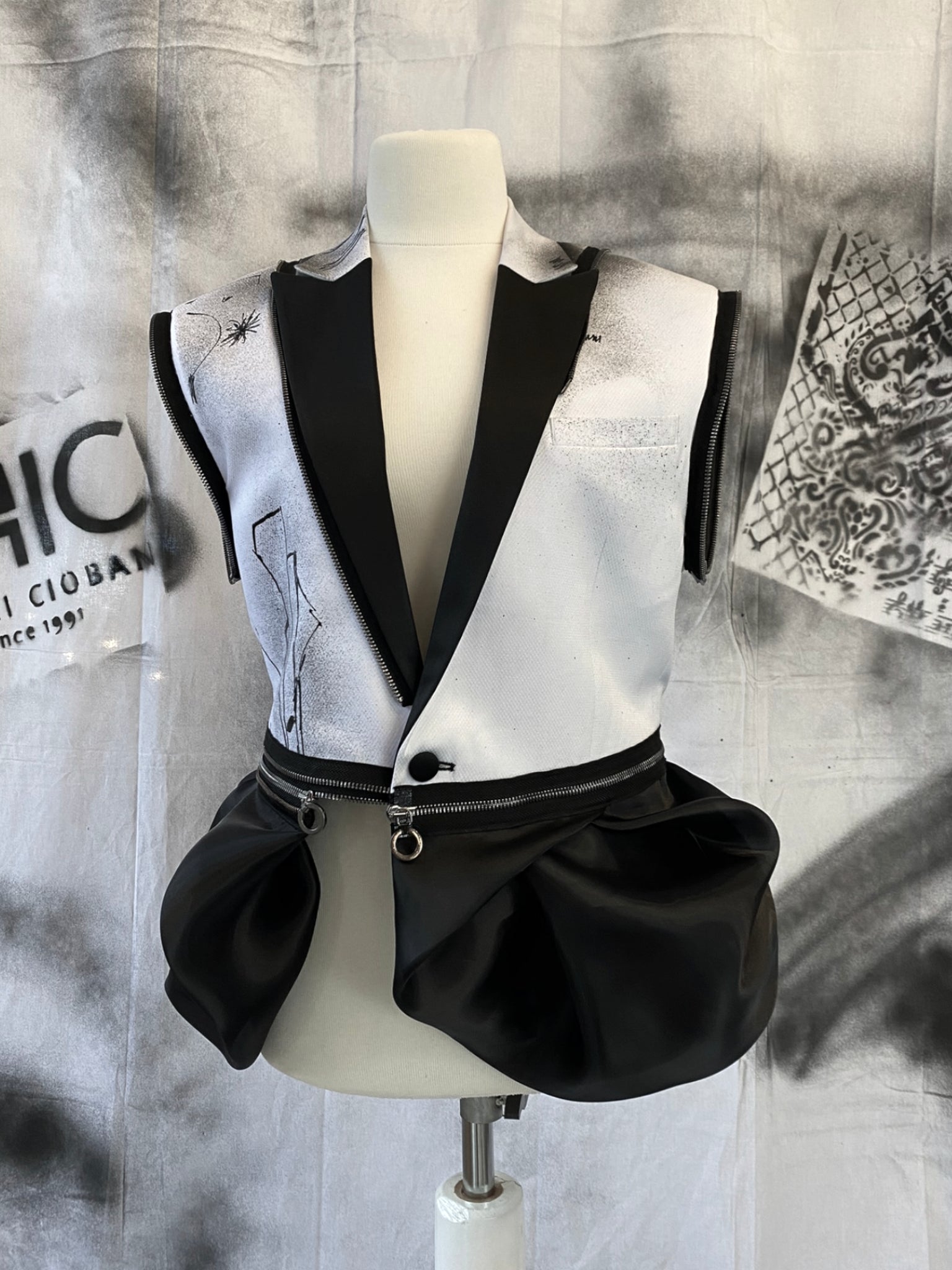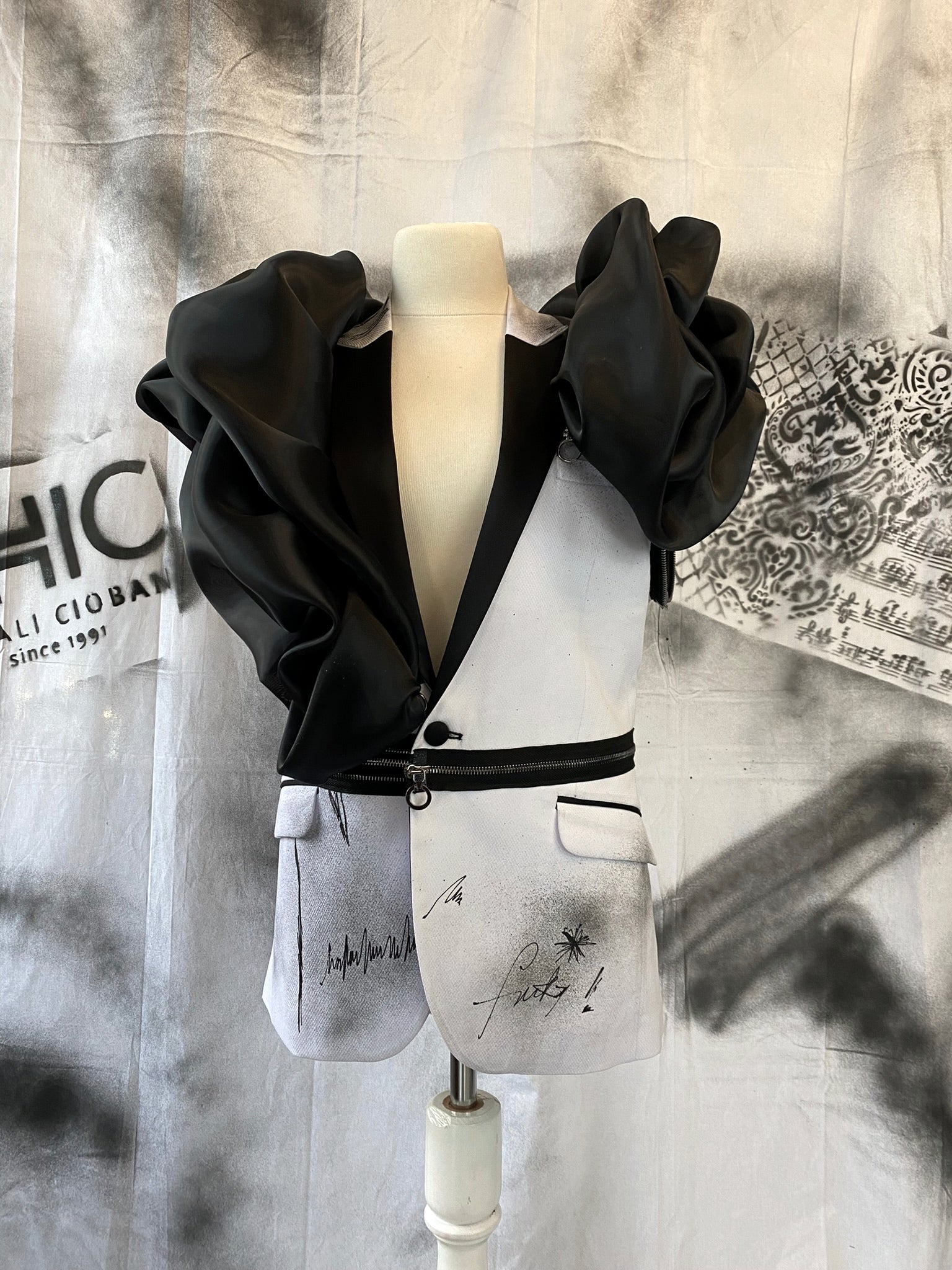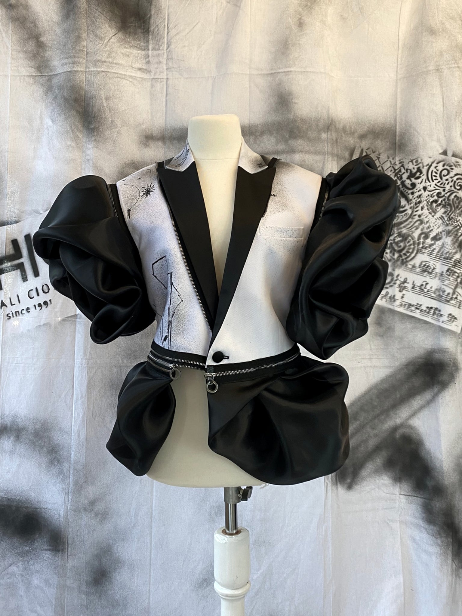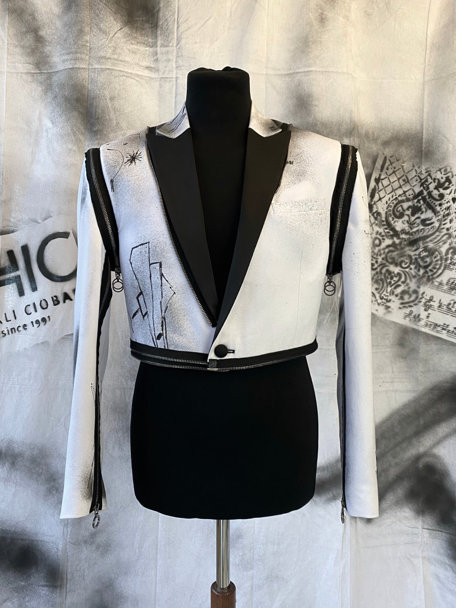 Unisex smoking jacket with metallic zippers from the Puzzle S/S'23 Collection. This item is a must have, as it can be deconstructed and reconstructed in multiple ways, this way creating numerous looks from casual to edgy to elegant. It can be worn as a stand-alone blazer or as a cropped blazer with a short skirt.