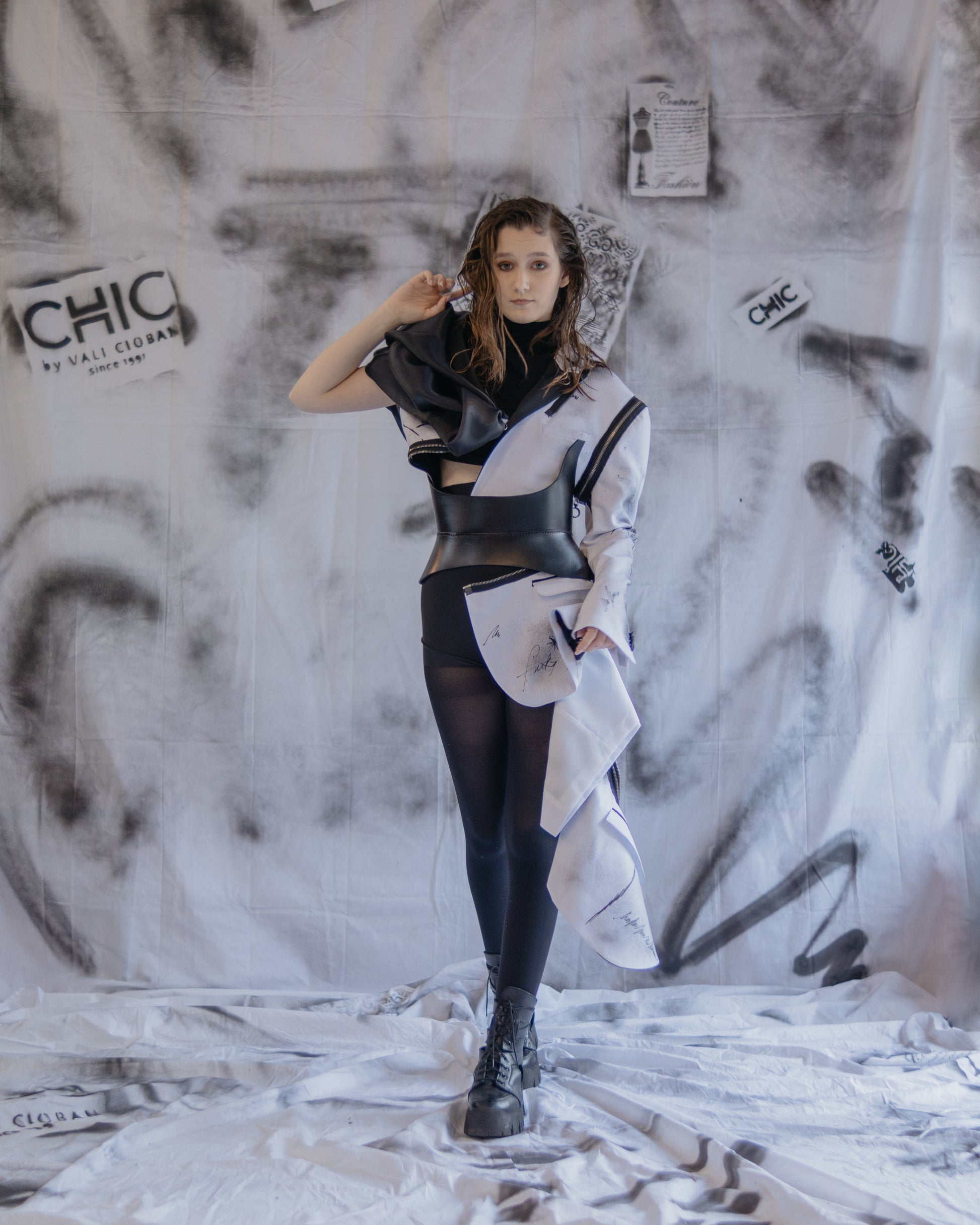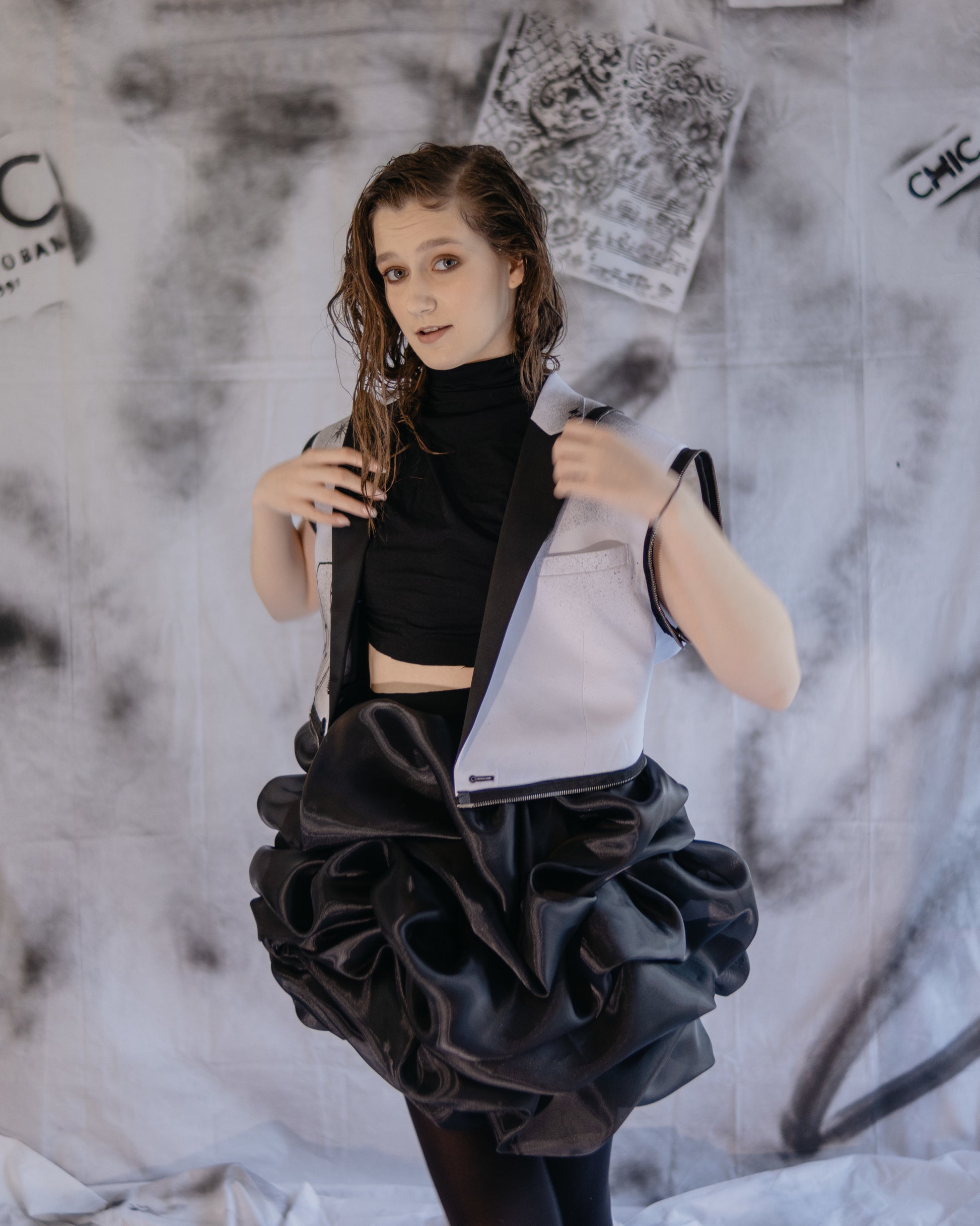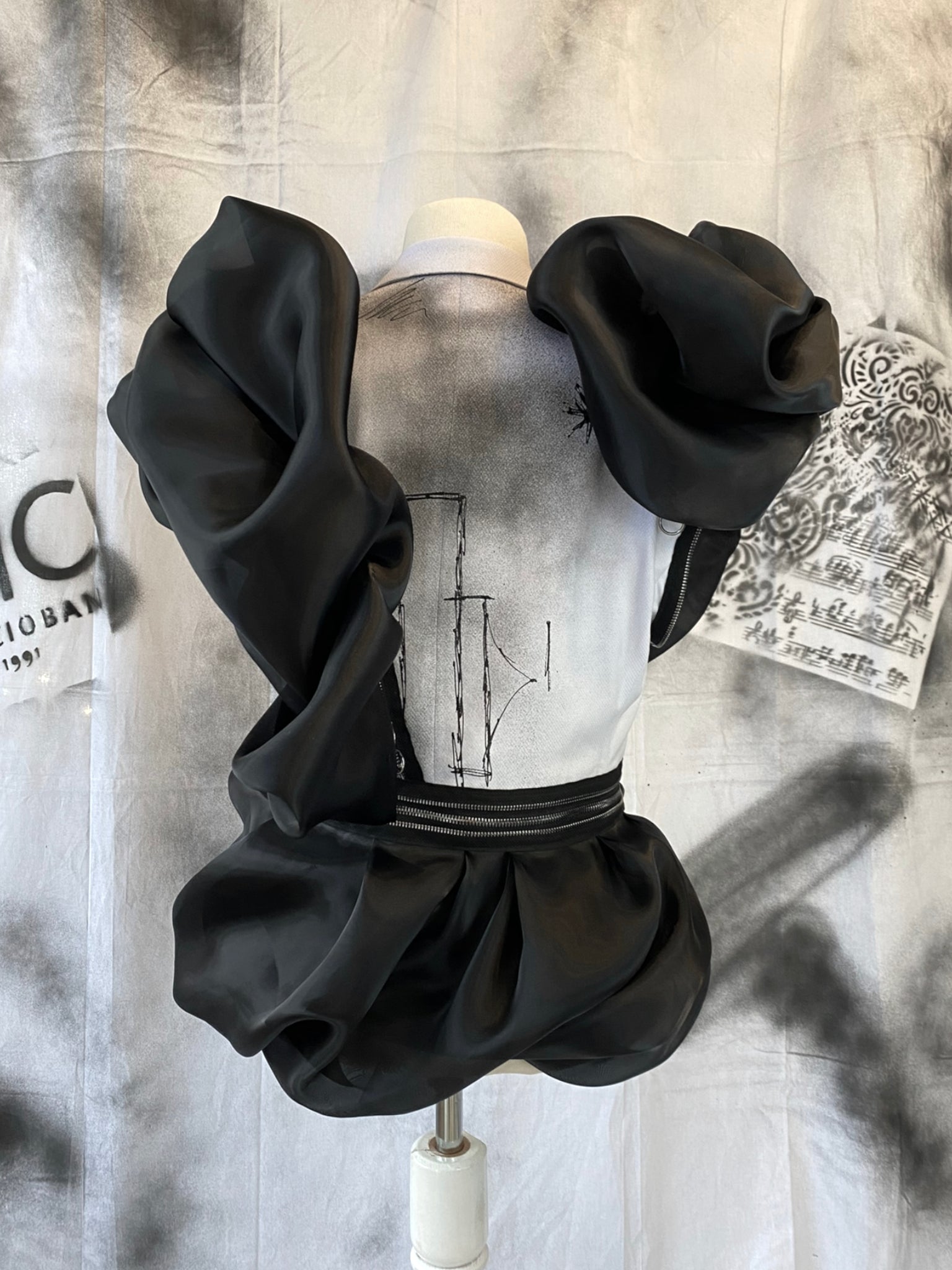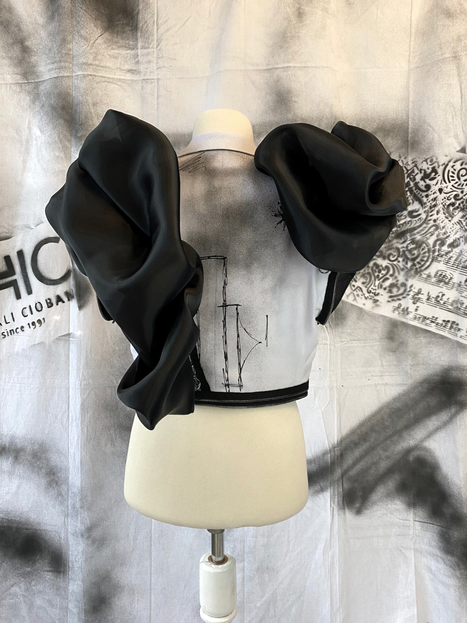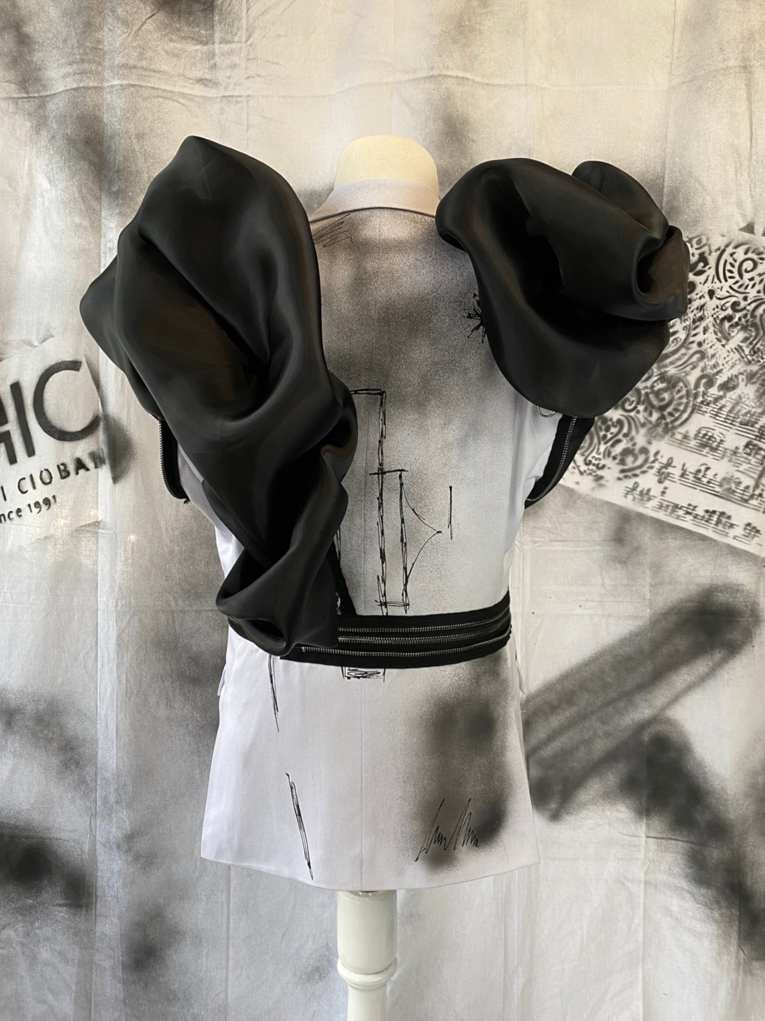 Unisex smoking jacket with metallic zippers from the Puzzle S/S'23 Collection. This item is a must have, as it can be deconstructed and reconstructed in multiple ways, this way creating numerous looks from casual to edgy to elegant. It can be worn as a stand-alone blazer or as a cropped blazer with a short skirt.