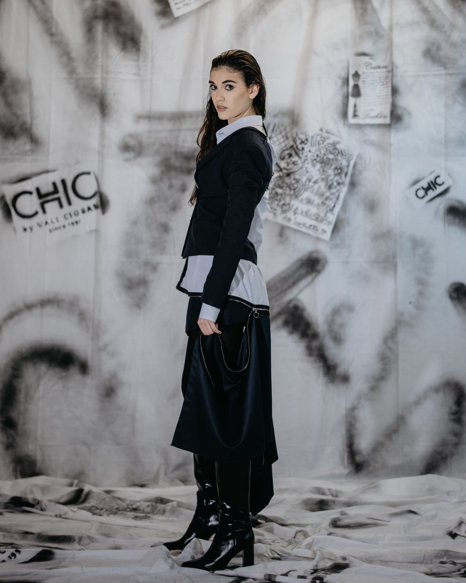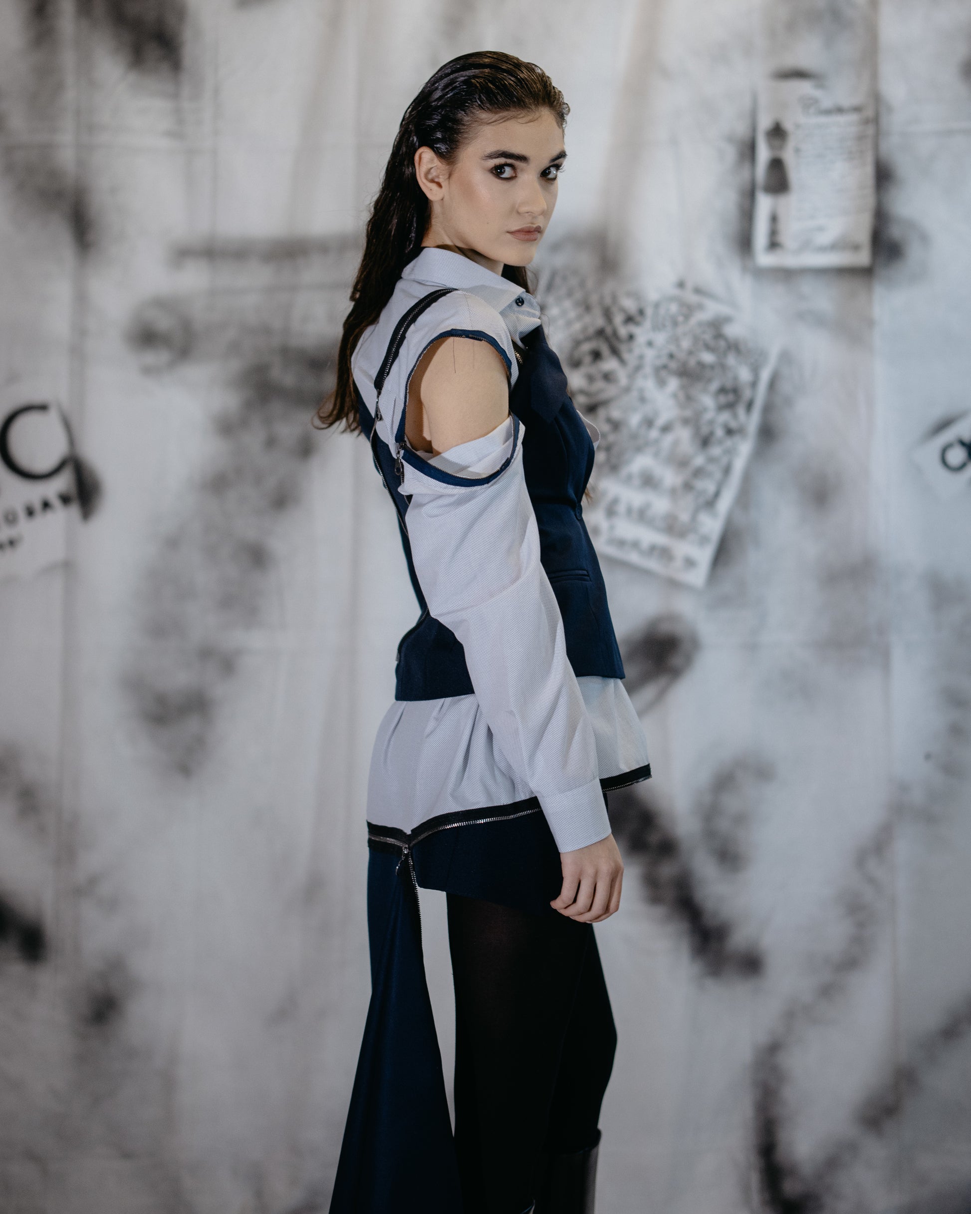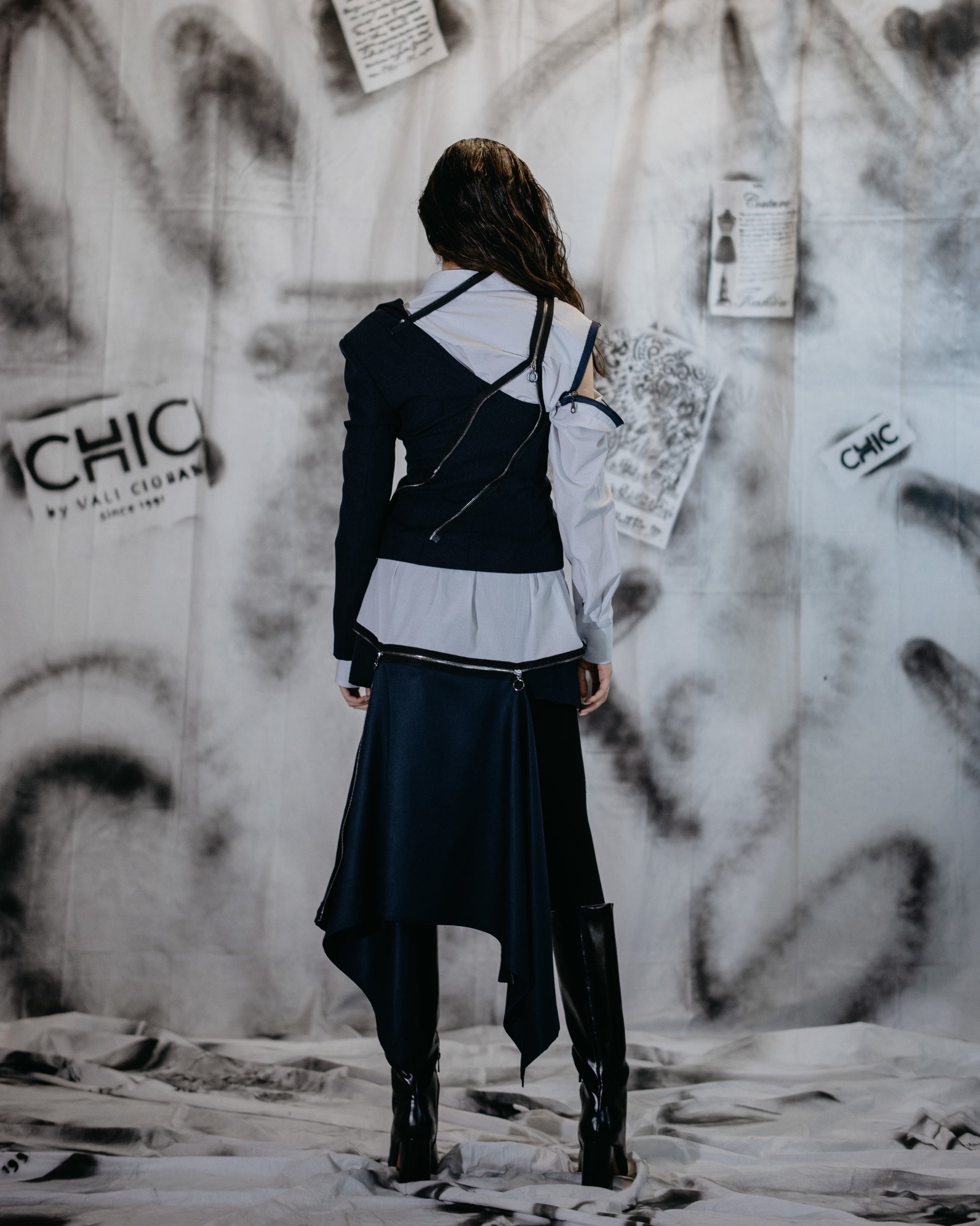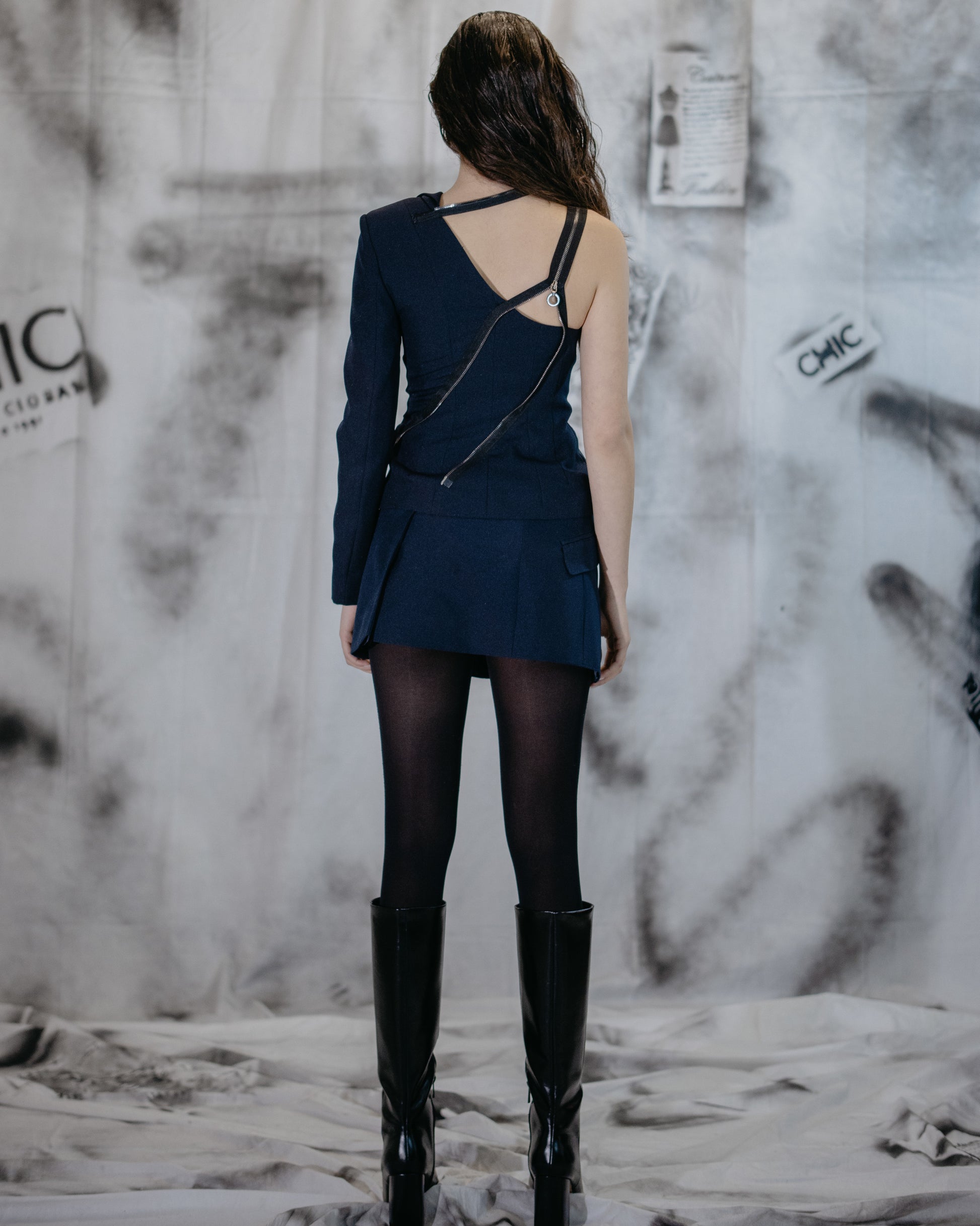 One shoulder blazer with decorative metallic zippers from the Puzzle Collection.