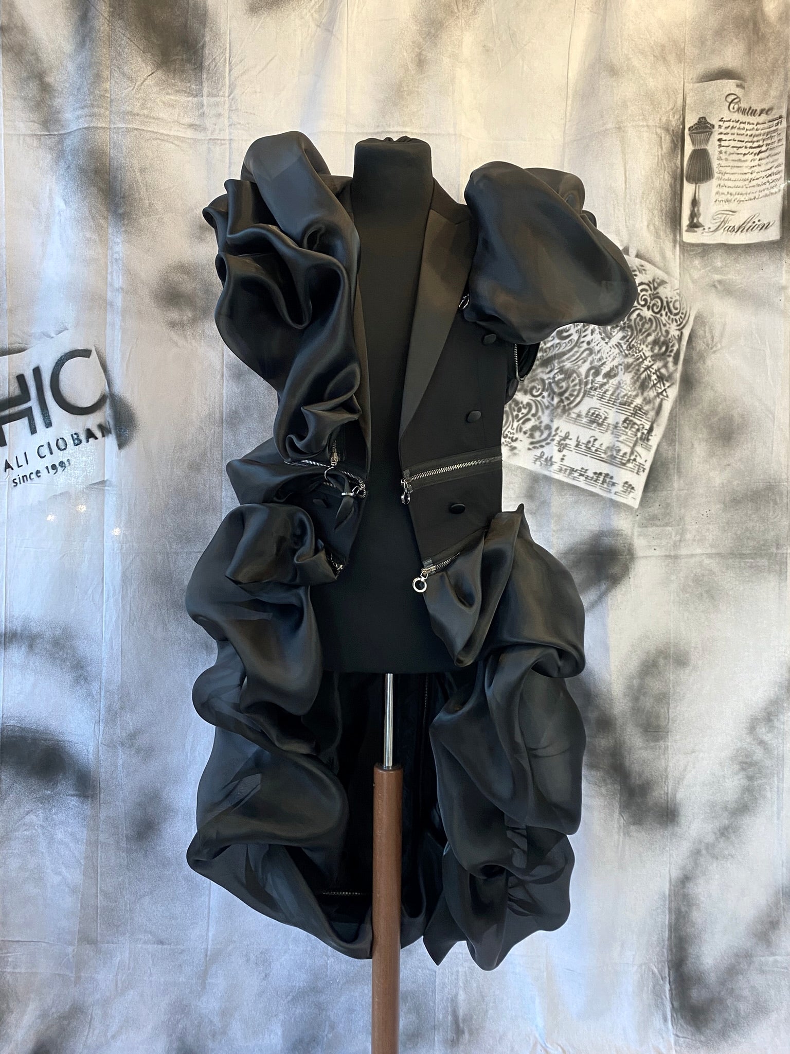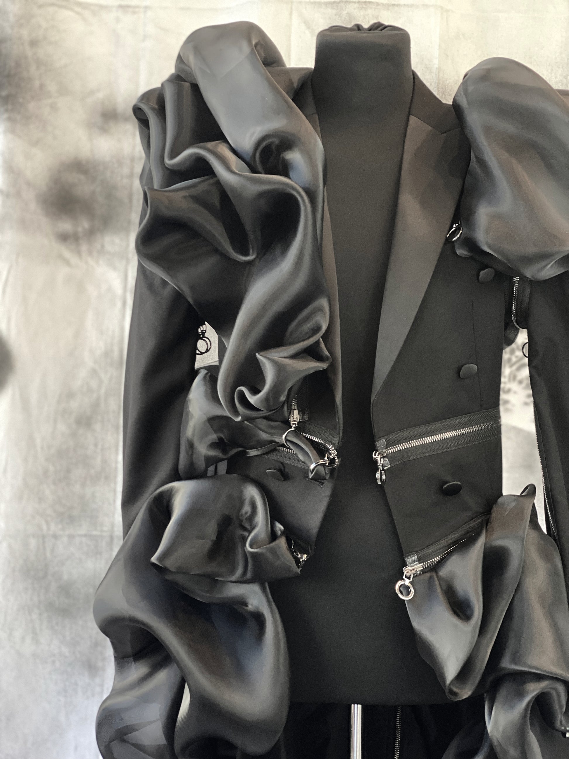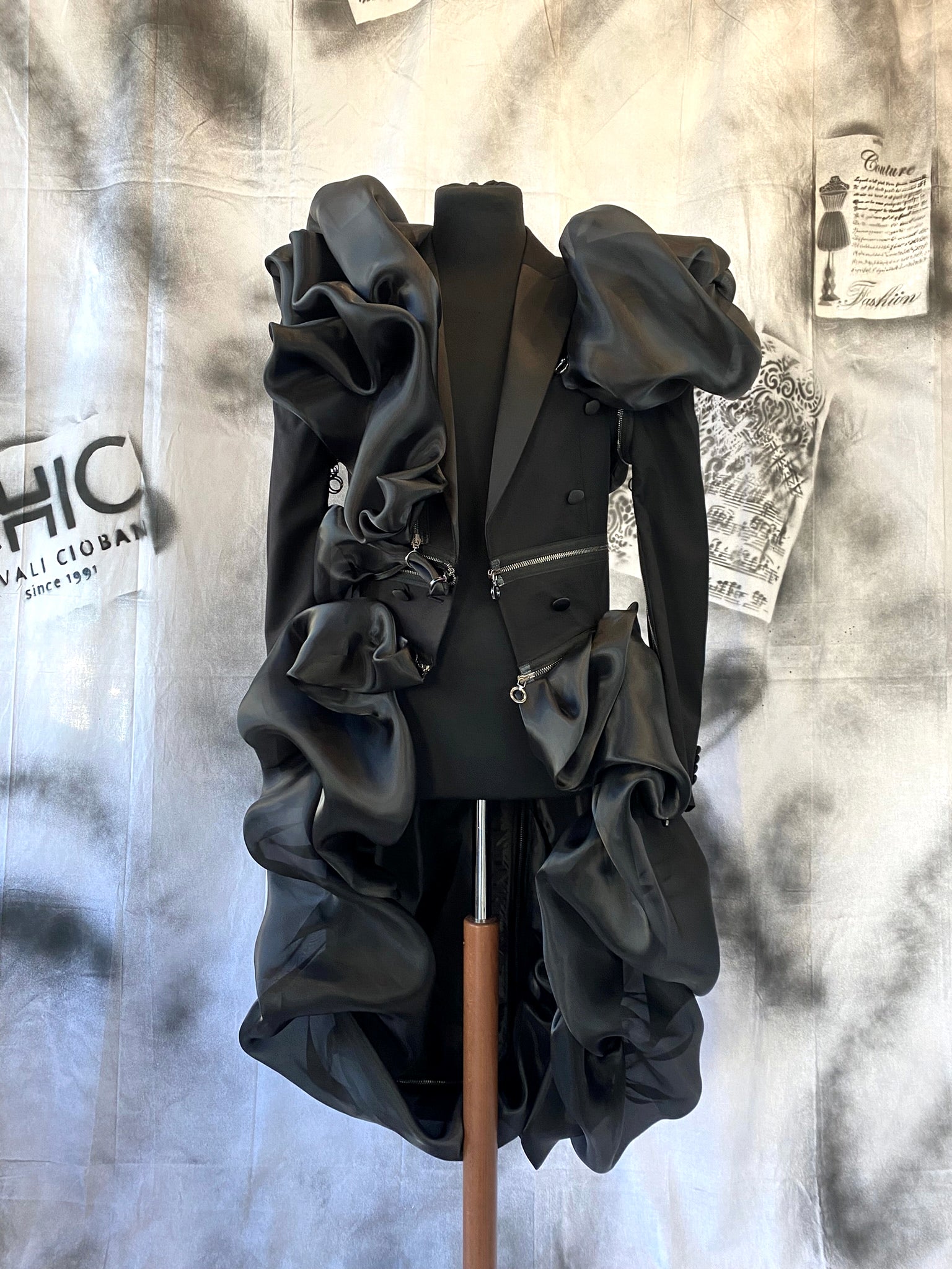 Puzzle Tailcoat With Organza Details And Metalic Zippers