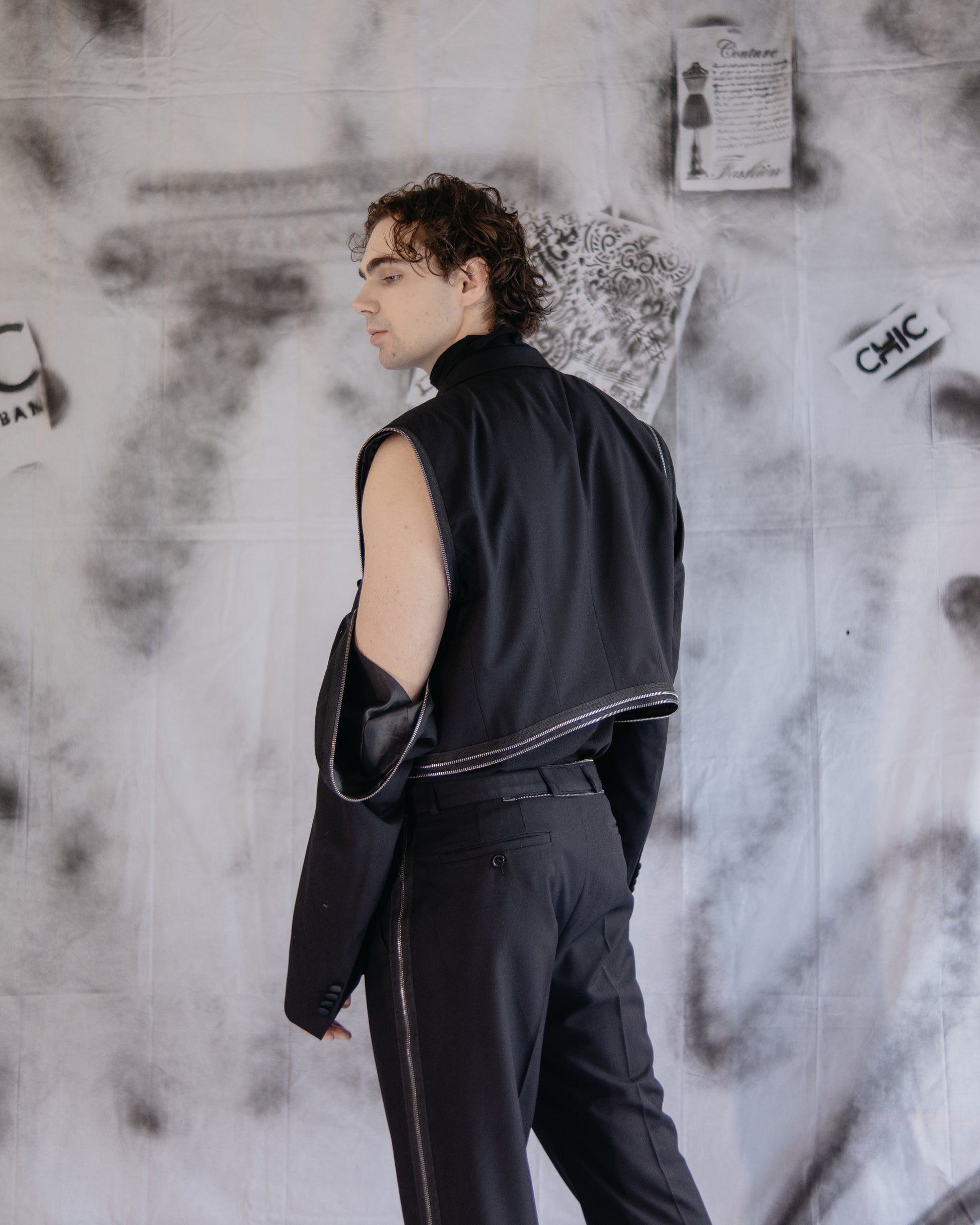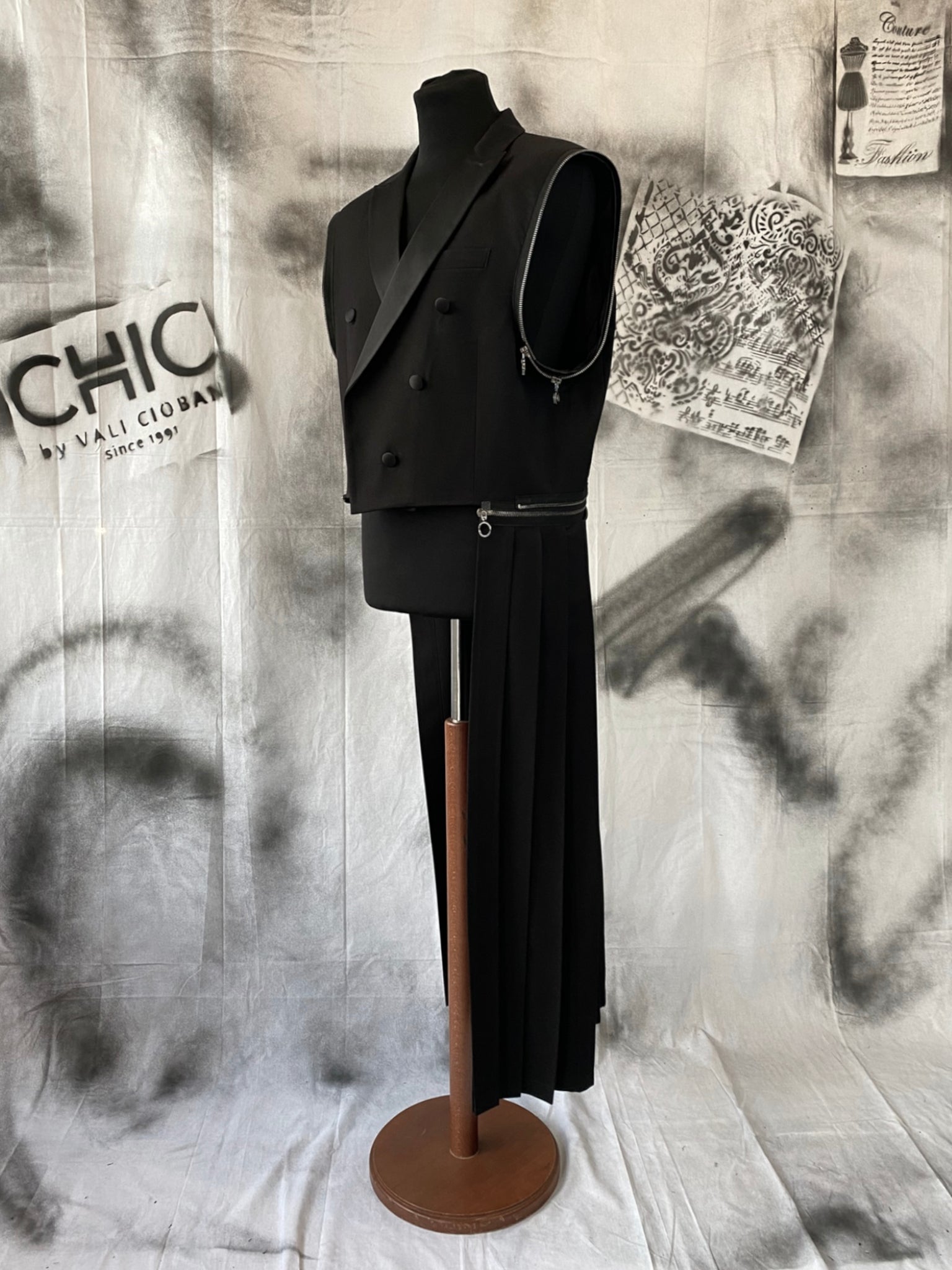 The tailcoat can be worn with or without sleeves and can even be left as a cropped jacket. It can be paired with the Puzzle trousers with the pleated skirt, and the pleated part can even be attached to the cropped jacket.