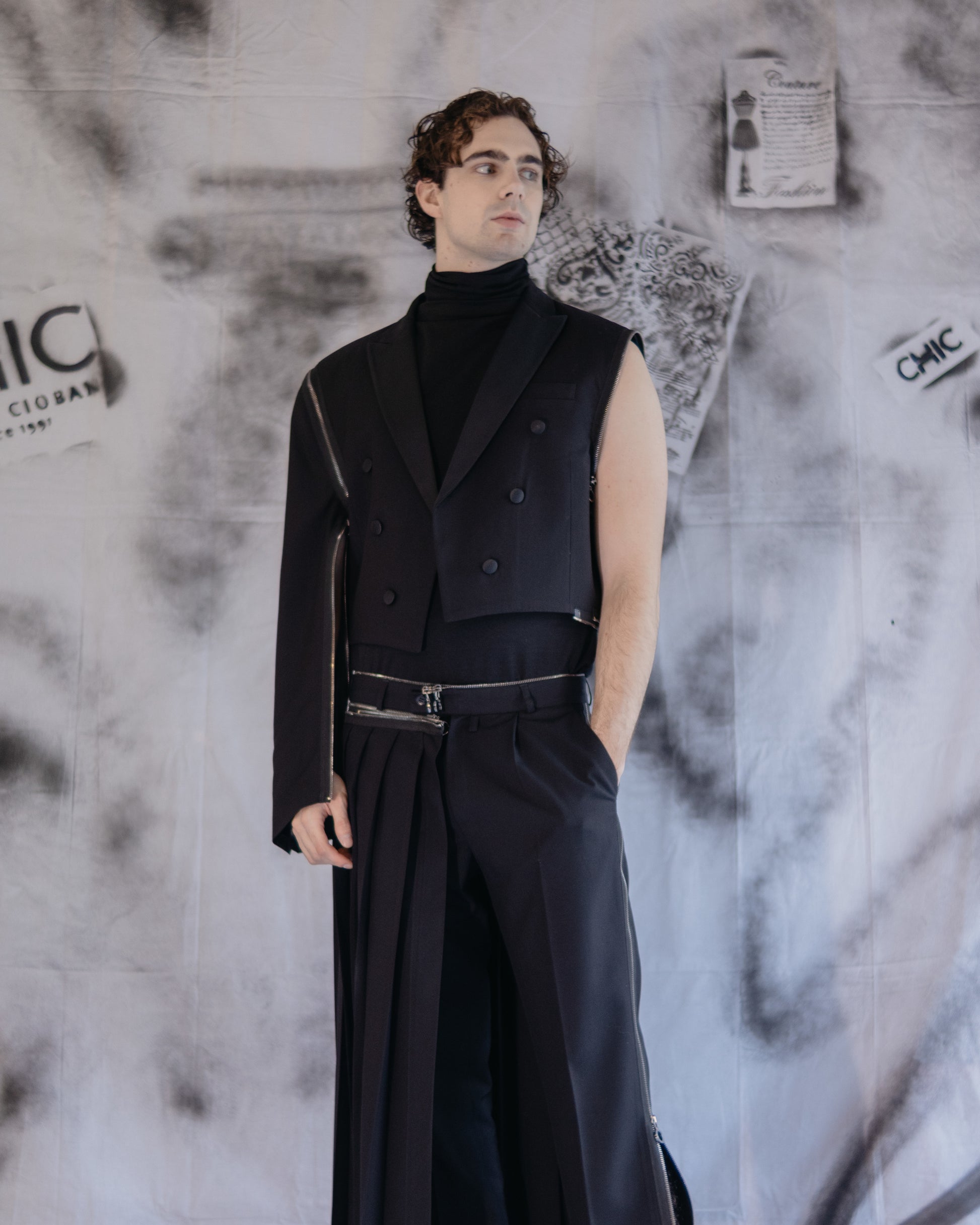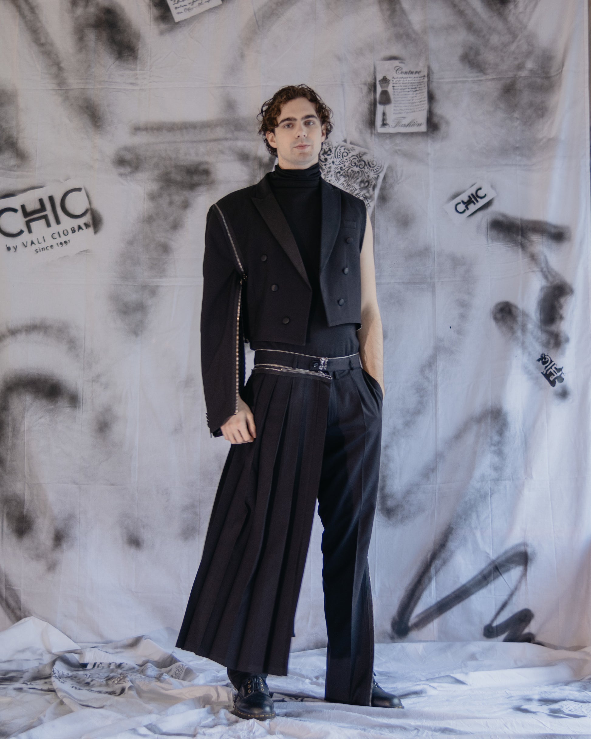 The pleated half-skirt can be worn with the trousers, or be attached to the Puzzle tailcoat or smoking jacket.
