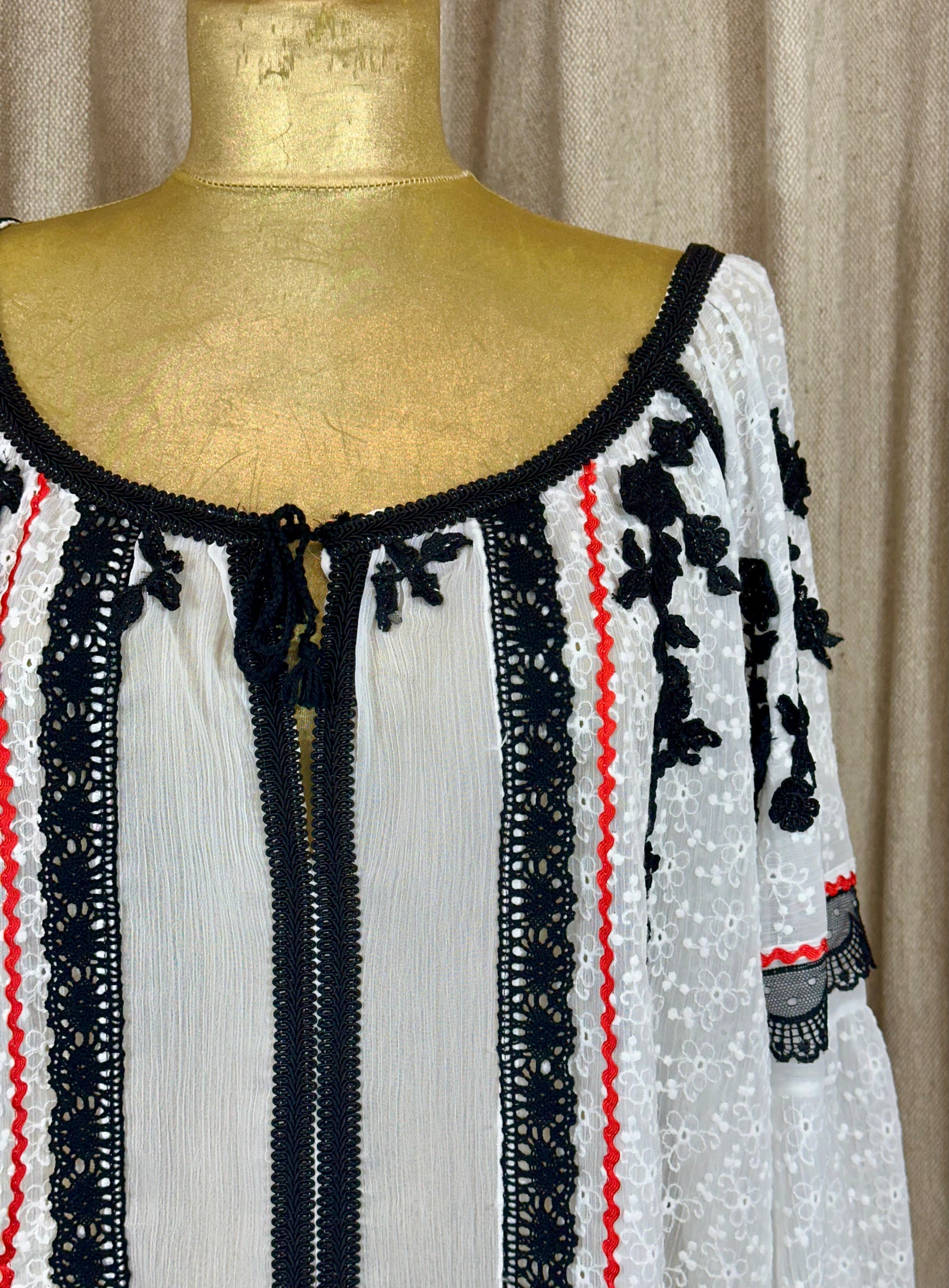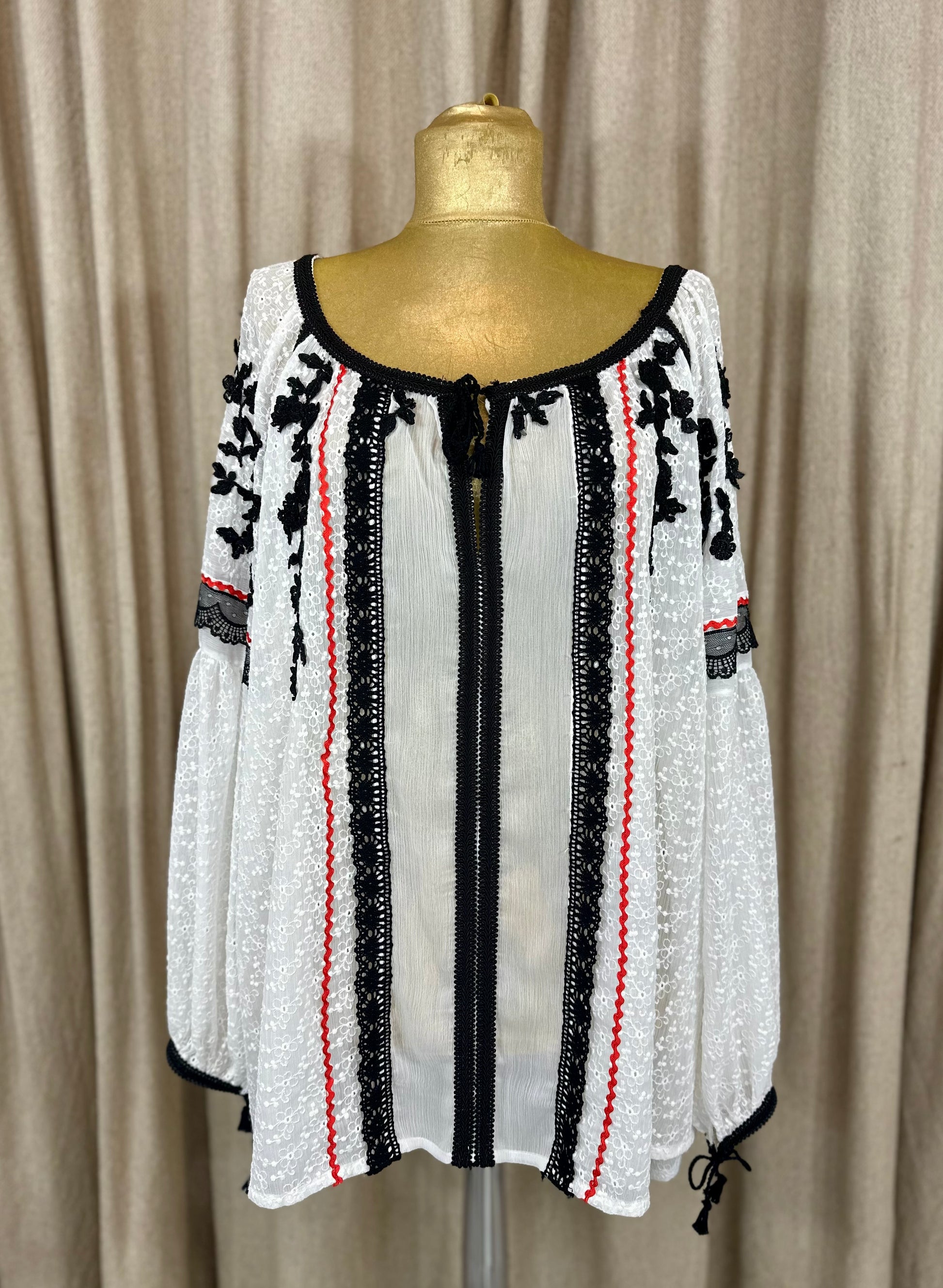 This elegant white Romanian blouse is inspired by traditional clothing and features delicate black and red lace details. Bring a touch of culture and beauty to your wardrobe with this unique piece.