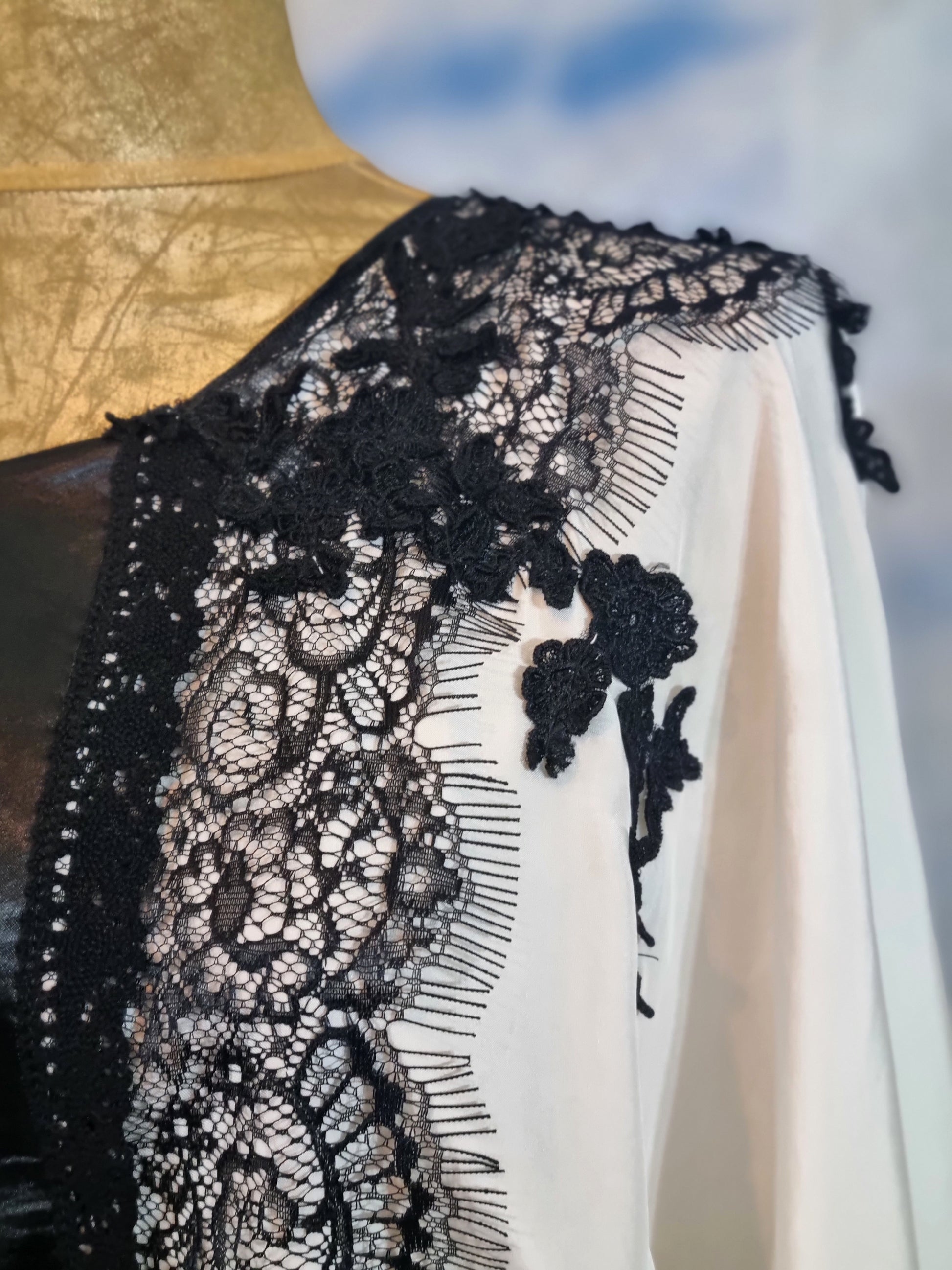 Look and feel like a goddess with this luxurious white silk dress featuring delicate black lace detailing. Its elegant silhouette will keep you feeling beautiful and confident wherever you go. Impress with sophistication and grace.